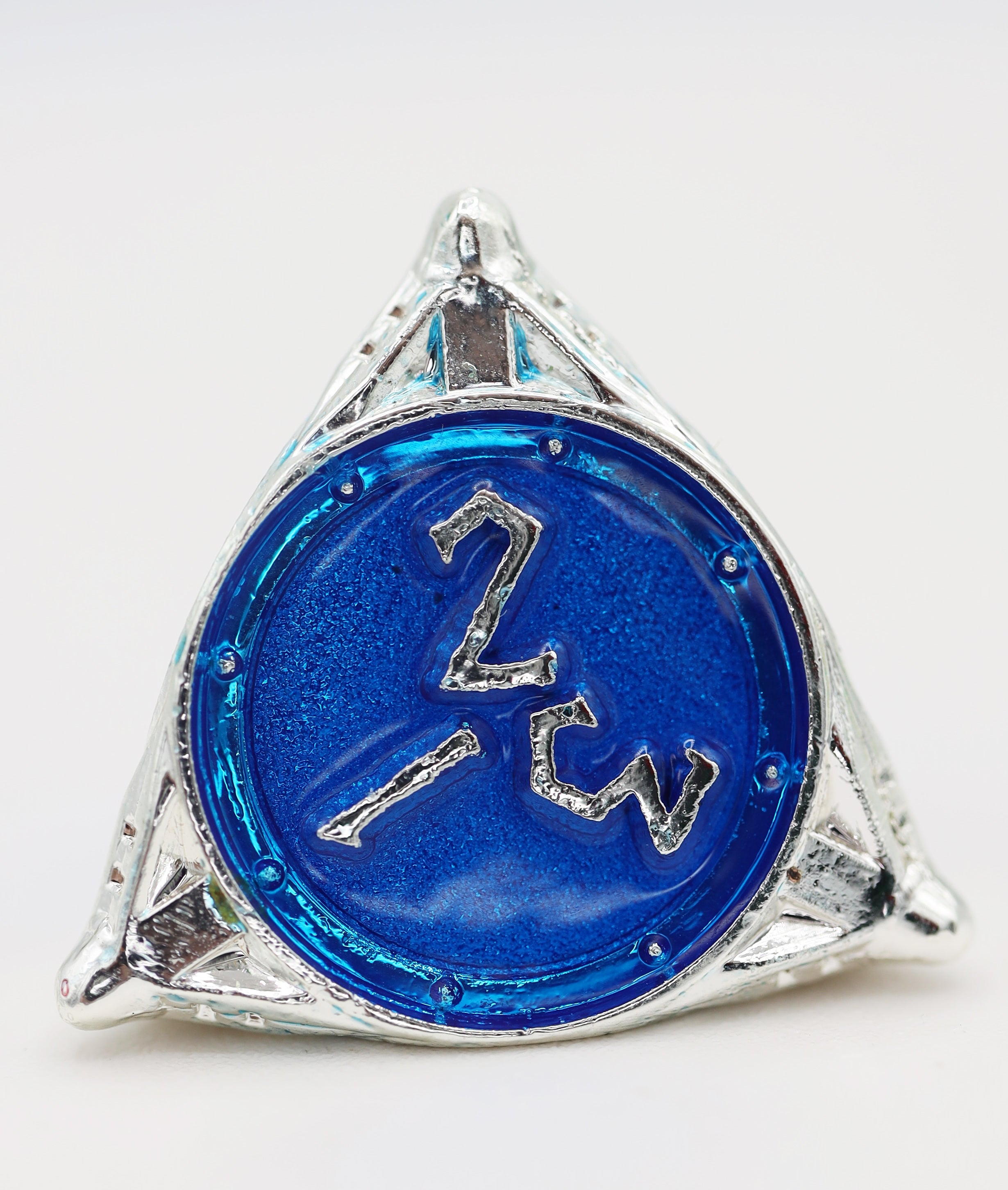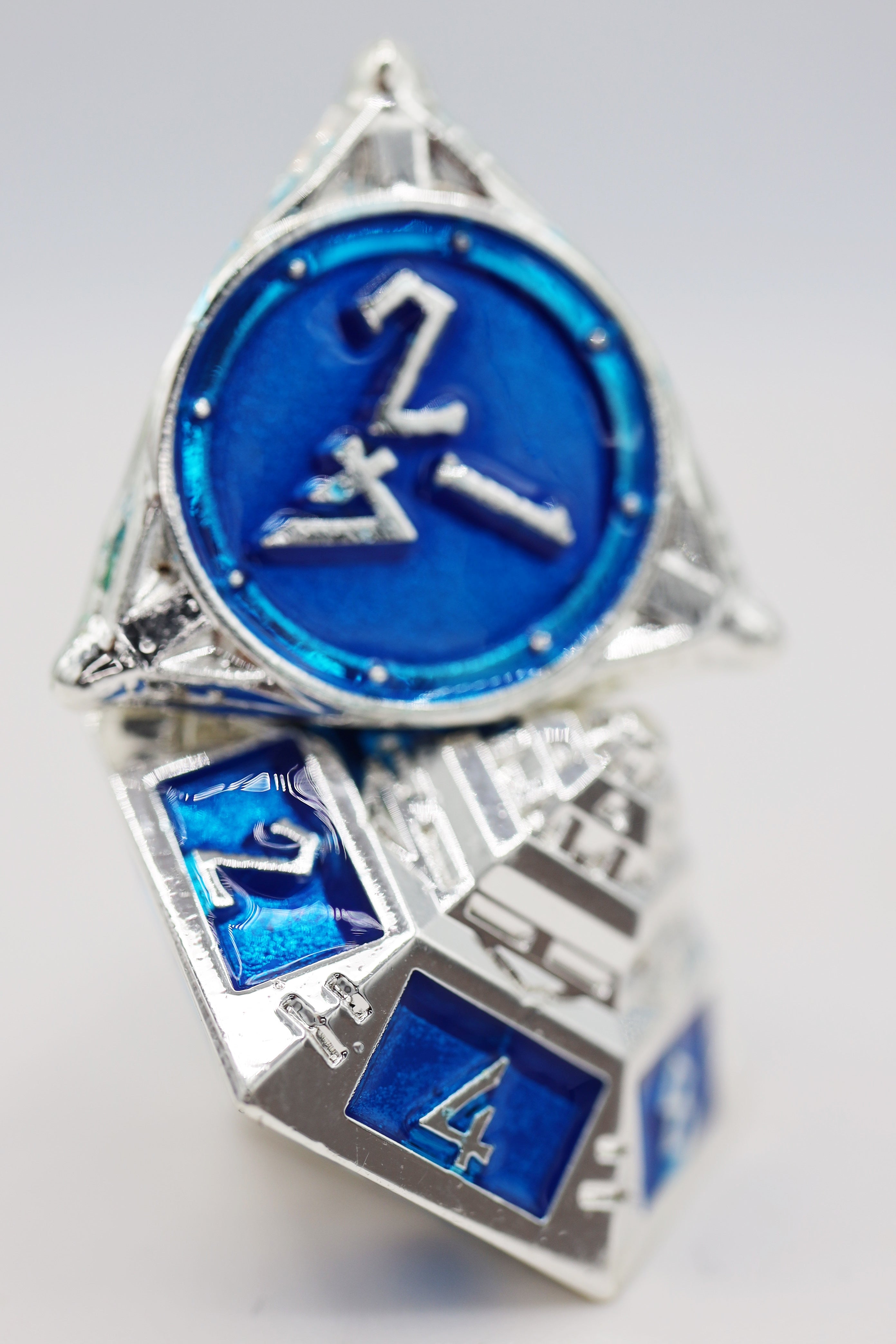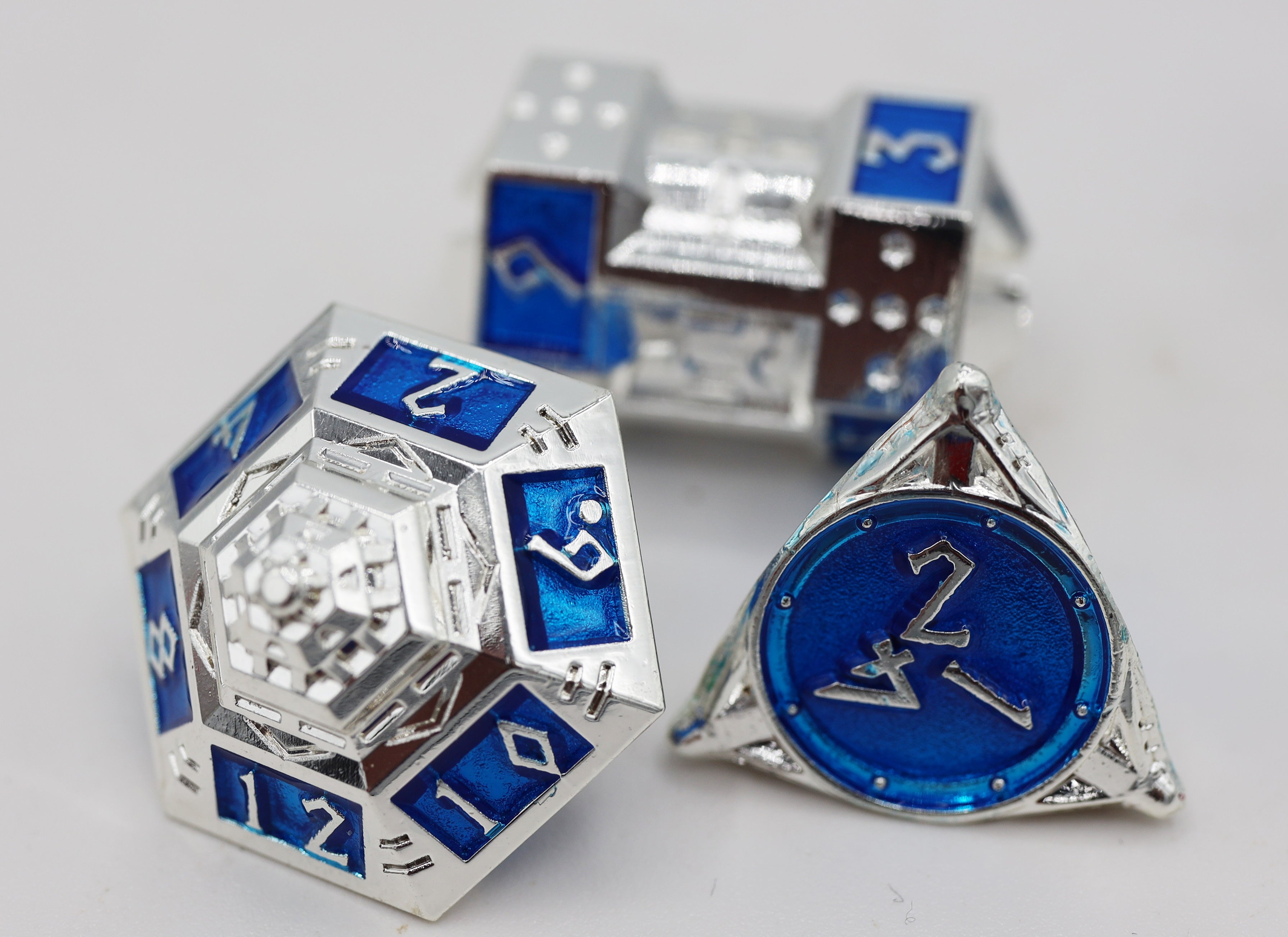 - Cast metal, electroplated dice with an enamel finish