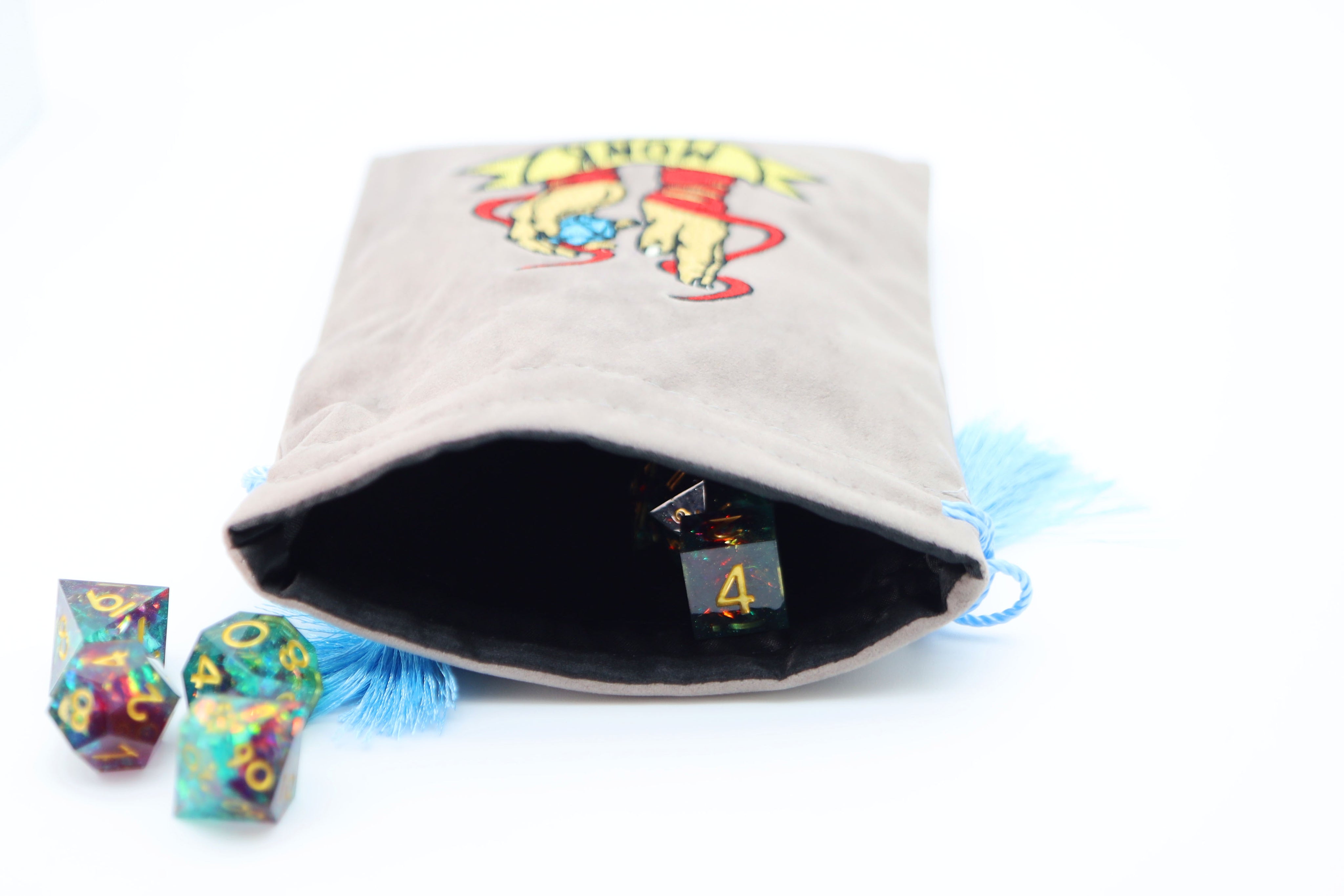 This dice bag is big enough to hold several sets of dice while not being bulky. It has an embroidered design on faux suede with a drawstring closure.