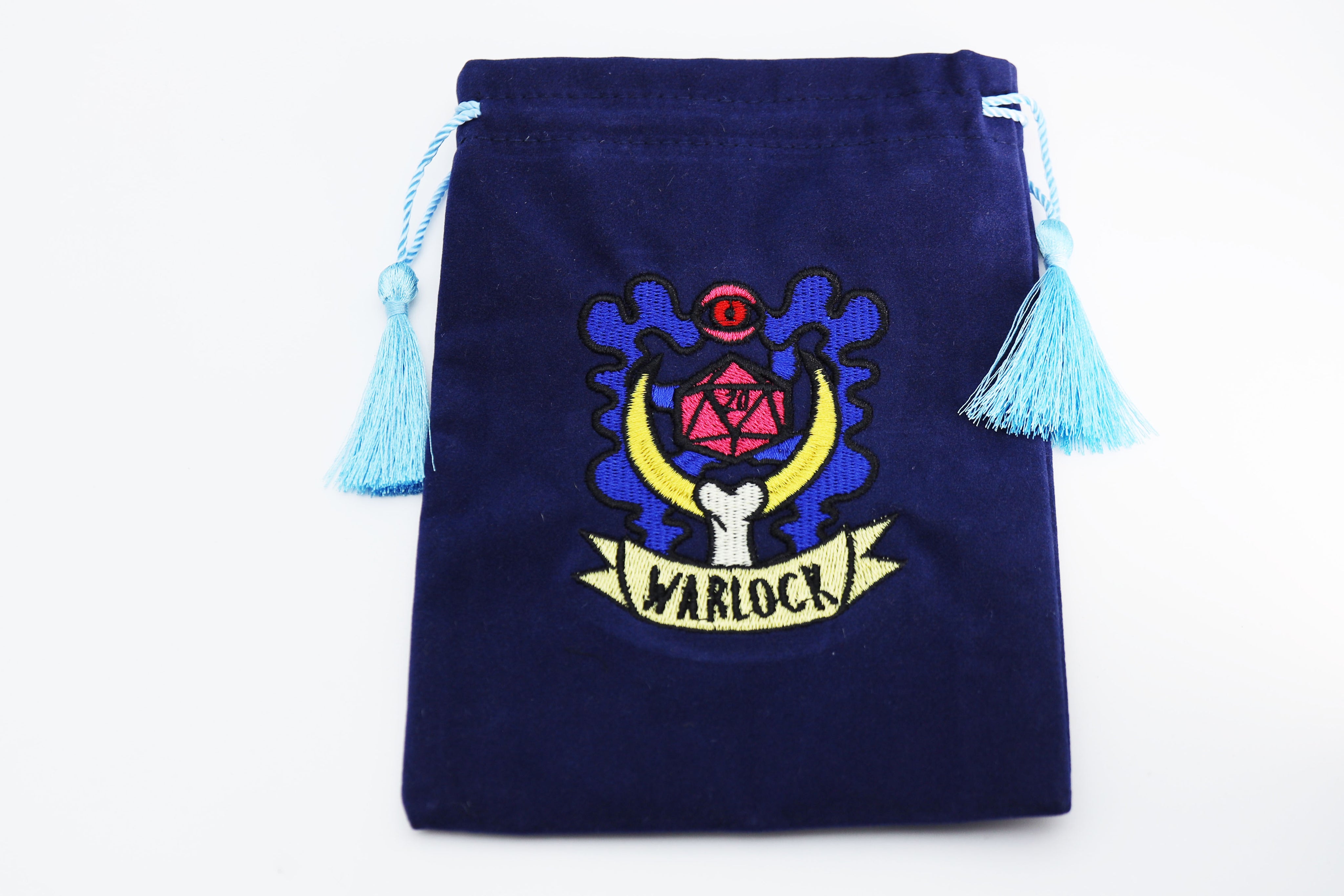 This dice bag is big enough to hold several sets of dice while not being bulky. It has an embroidered design on faux suede with a drawstring closure.
