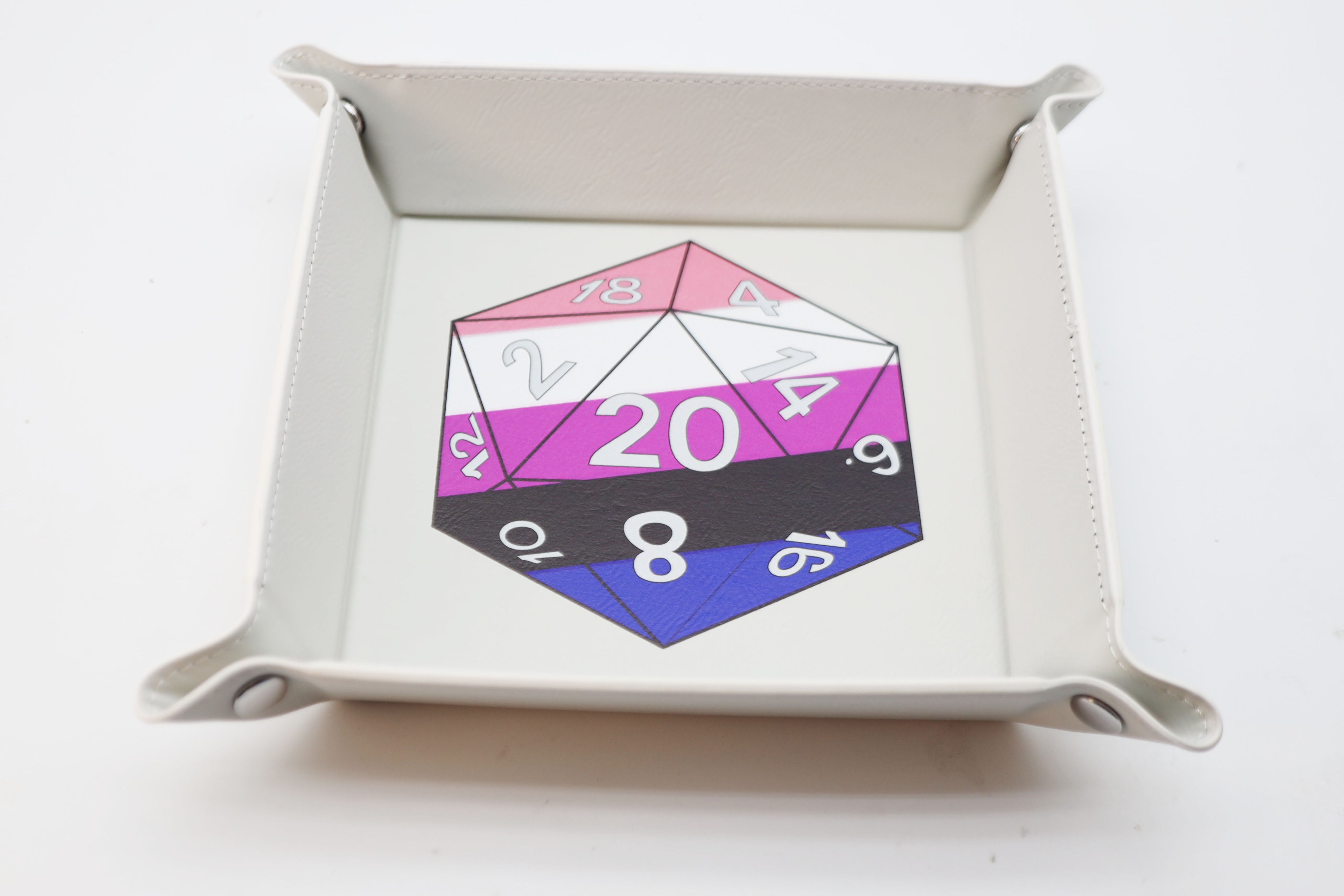 Show your pride with our collapsible dice tray! This dice tray is made with durable leatherette and strong metal snap buttons. It's perfect for the traveling player or Dungeon Master. The tray stays flat and snaps together when you're ready to play!