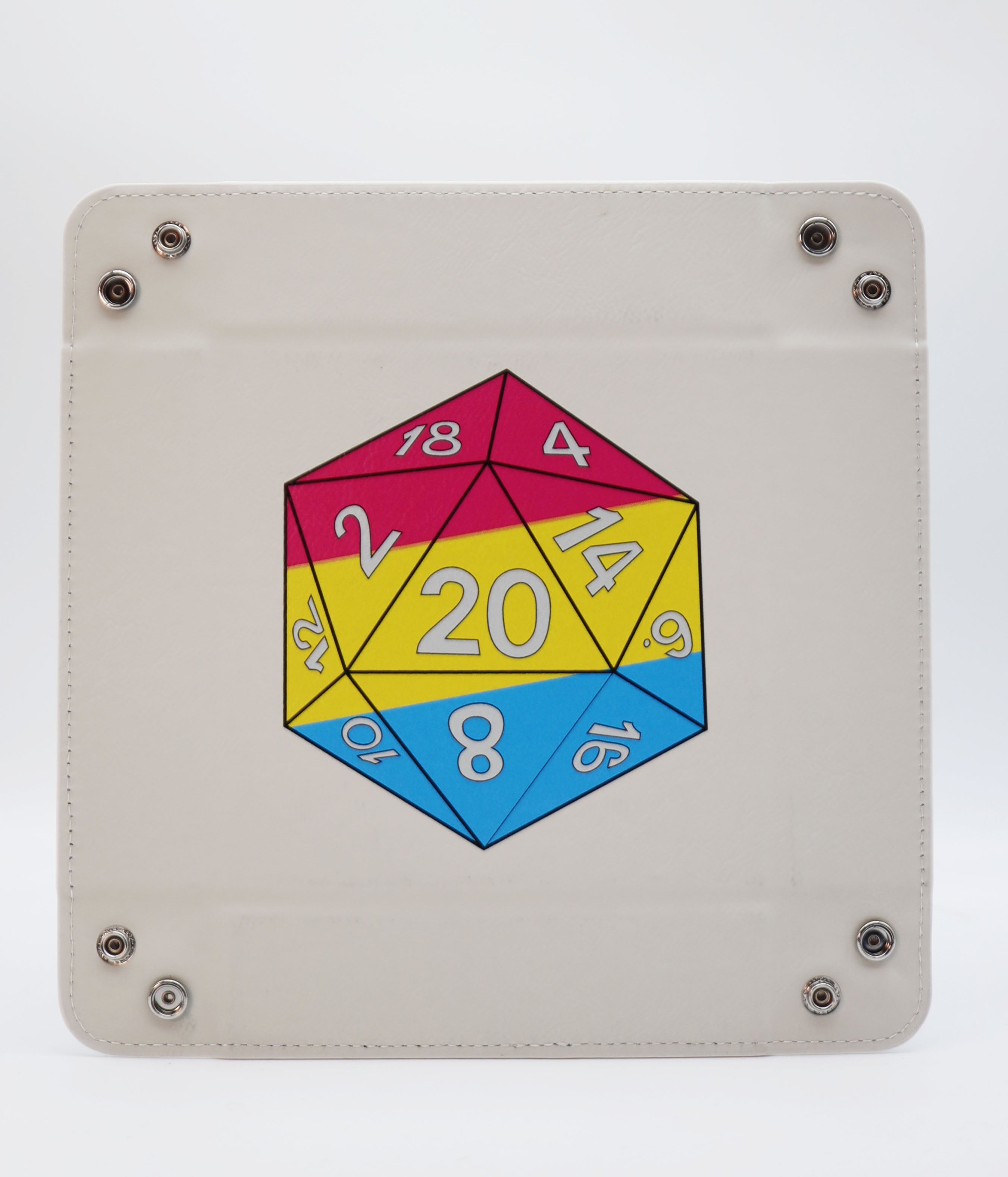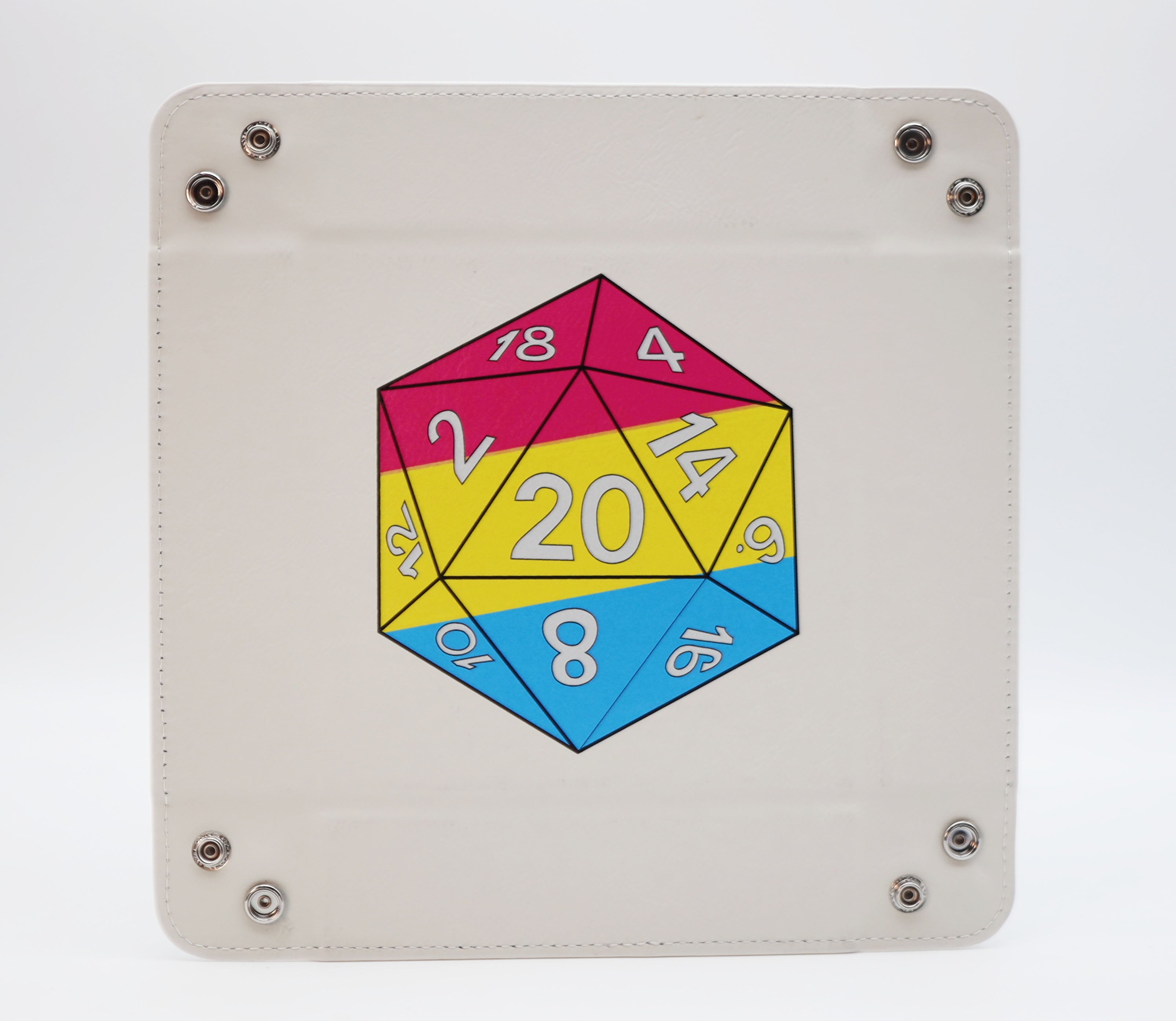 Show your pride with our collapsible dice tray! This dice tray is made with durable leatherette and strong metal snap buttons. It's perfect for the traveling player or Dungeon Master. The tray stays flat and snaps together when you're ready to play!