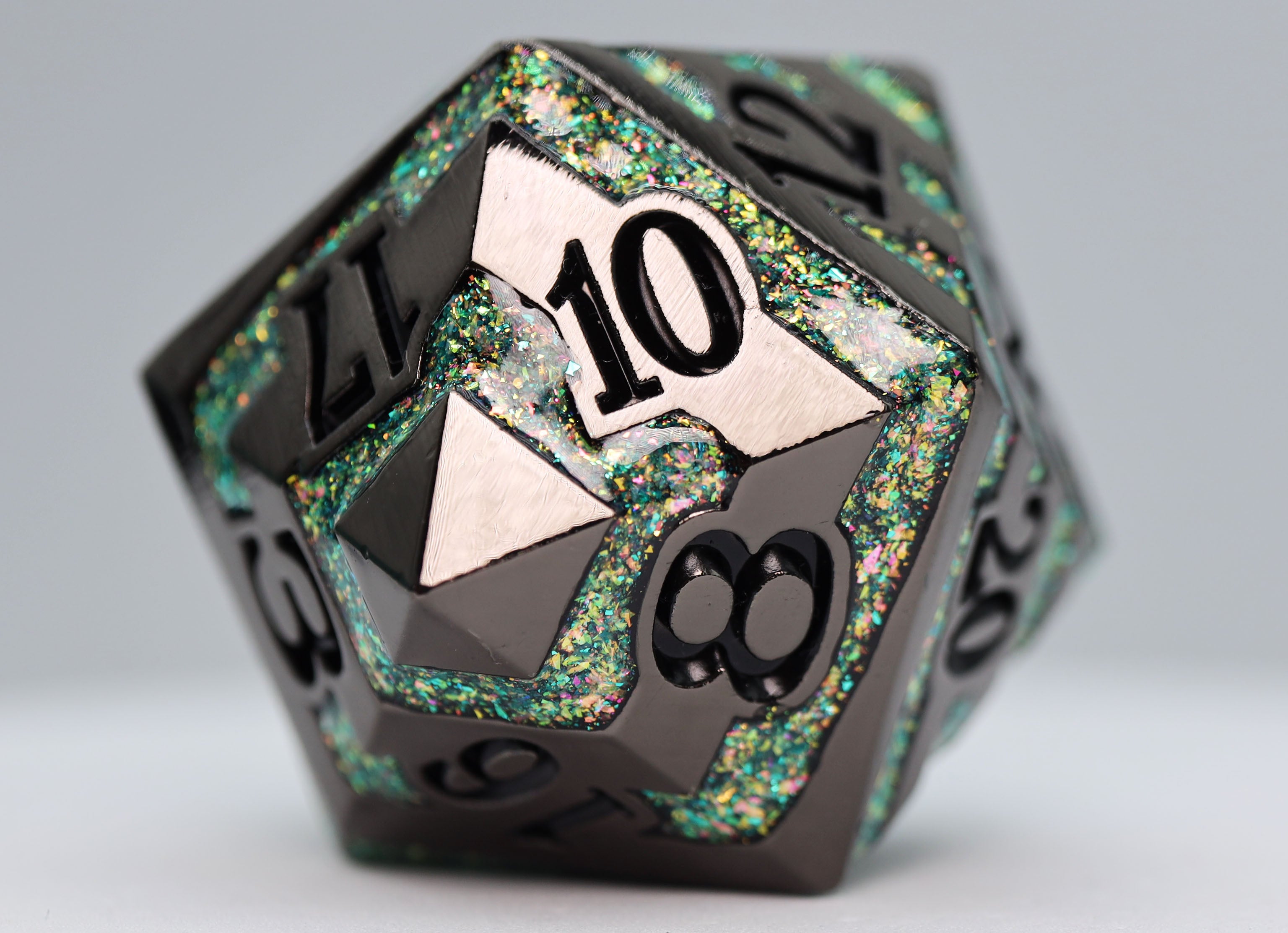 This gorgeous Foam Brain Games Extra Large Metal D20 is layered with colorful mica.