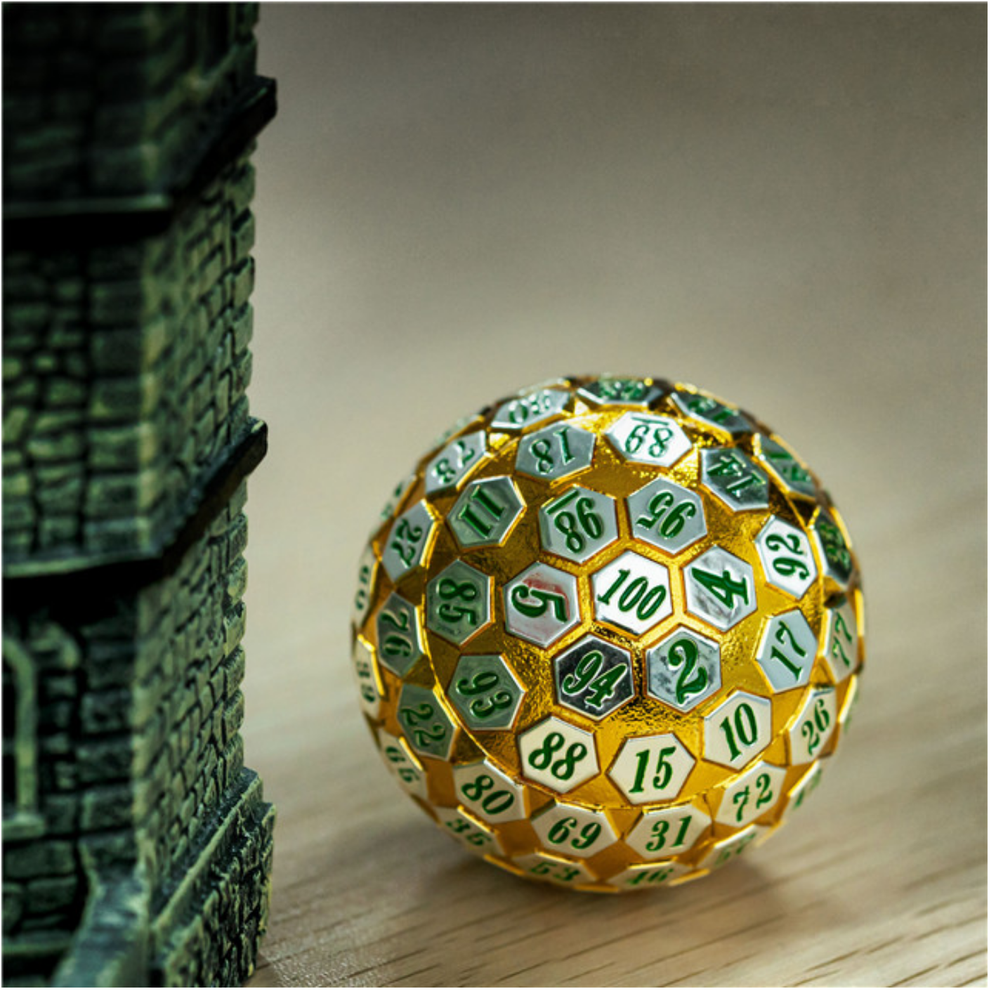 This D100 is AMAZING! It weights nearly 11 ounces and is the heaviest die we've ever carried. The numbers are raised making it very easy to stop rolling and to see which number is facing straight upward.