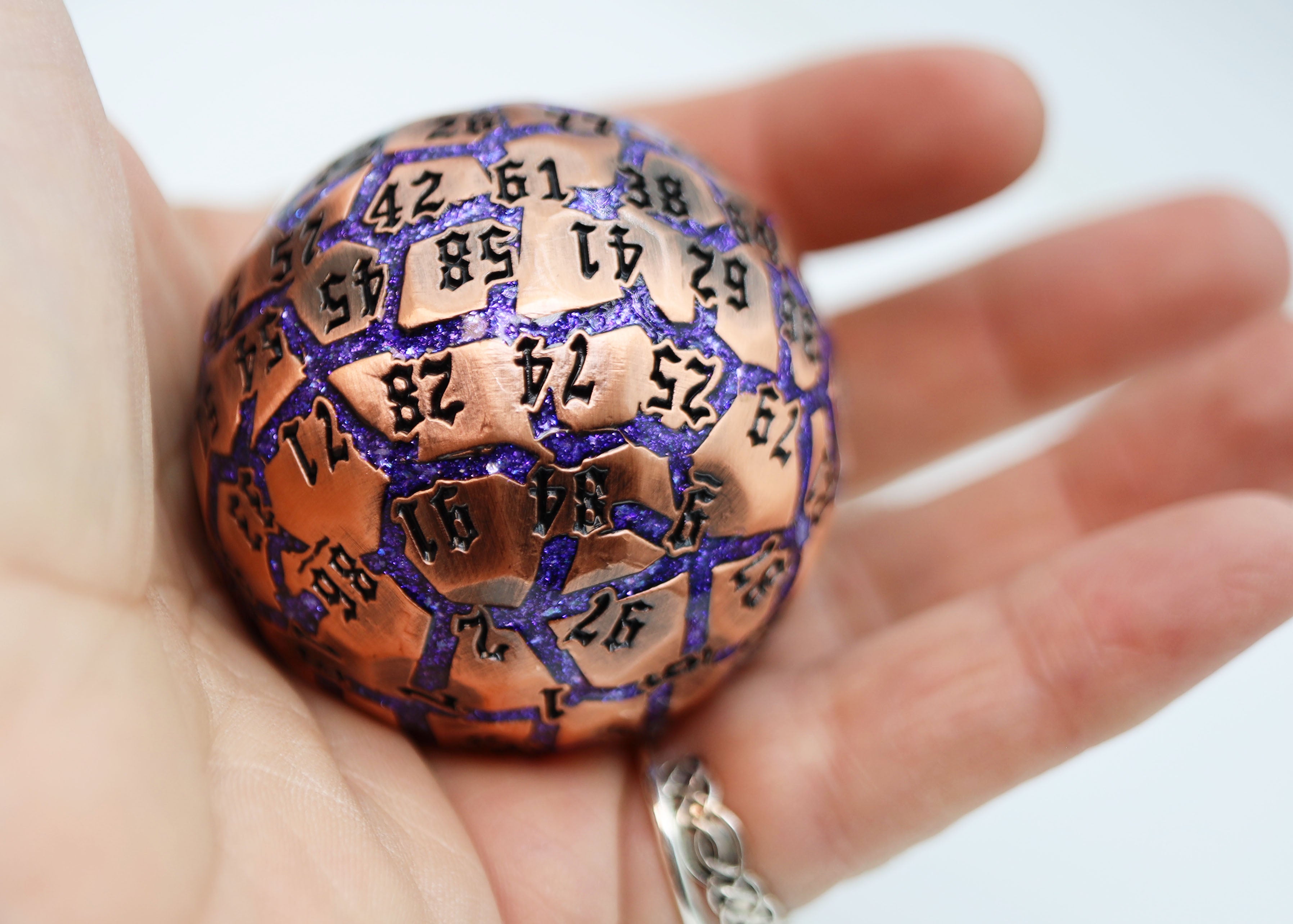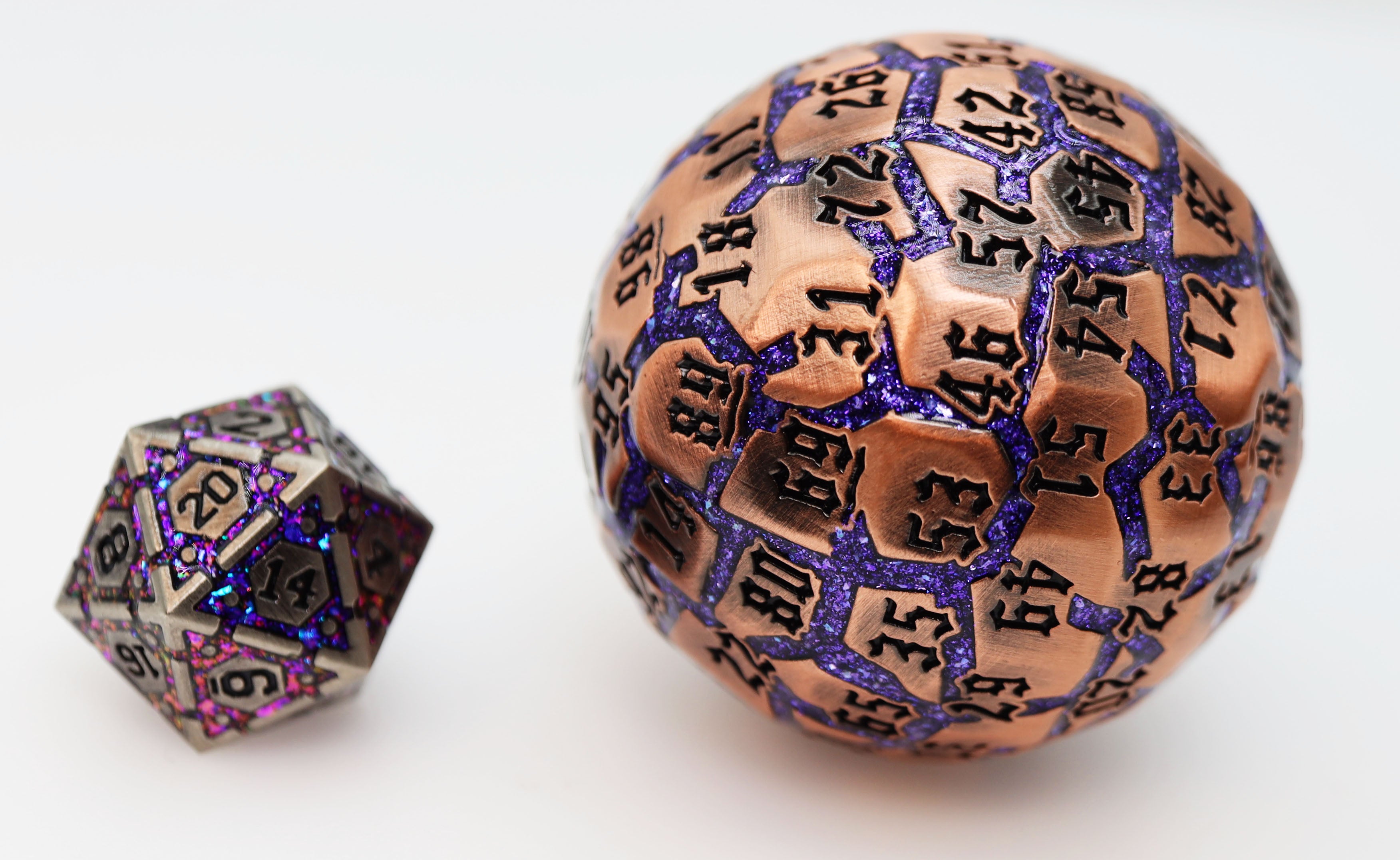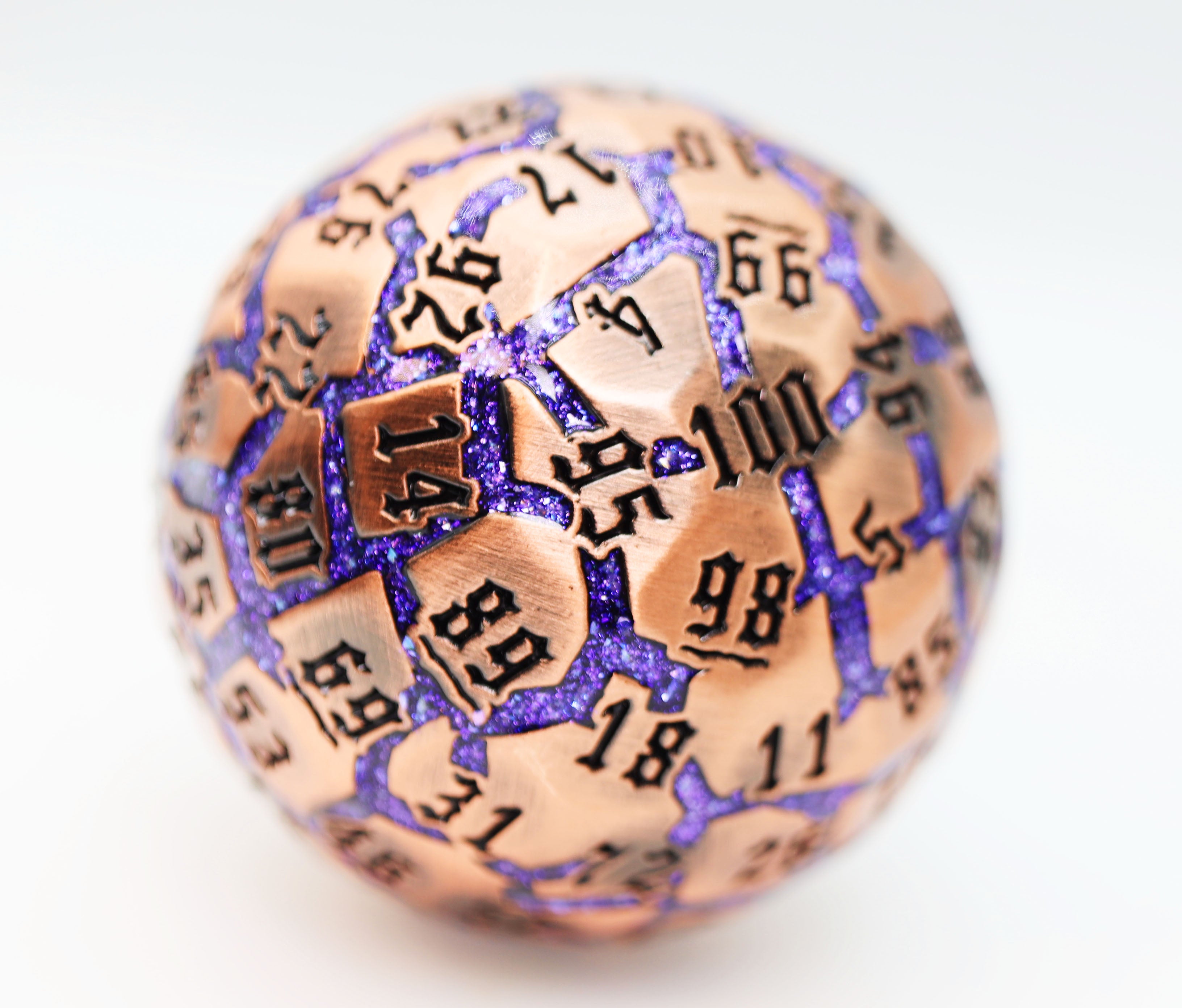 This gorgeous Foam Brain Games Metal D100 is layered with swirls of purple.