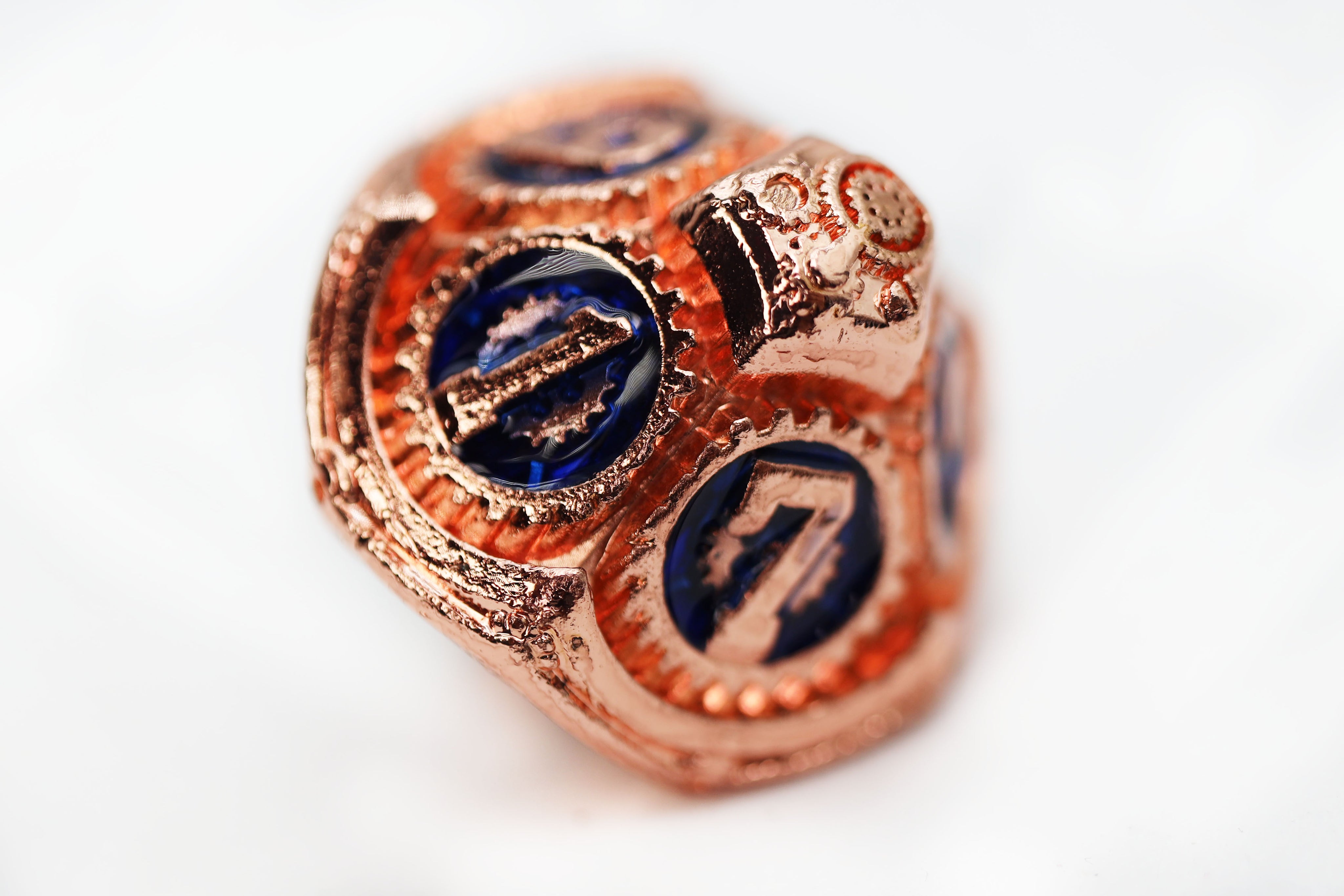 This Foam Brain Games Metal Dice Set with gear shaped details on the die faces is perfect for your next Steampunk adventure!