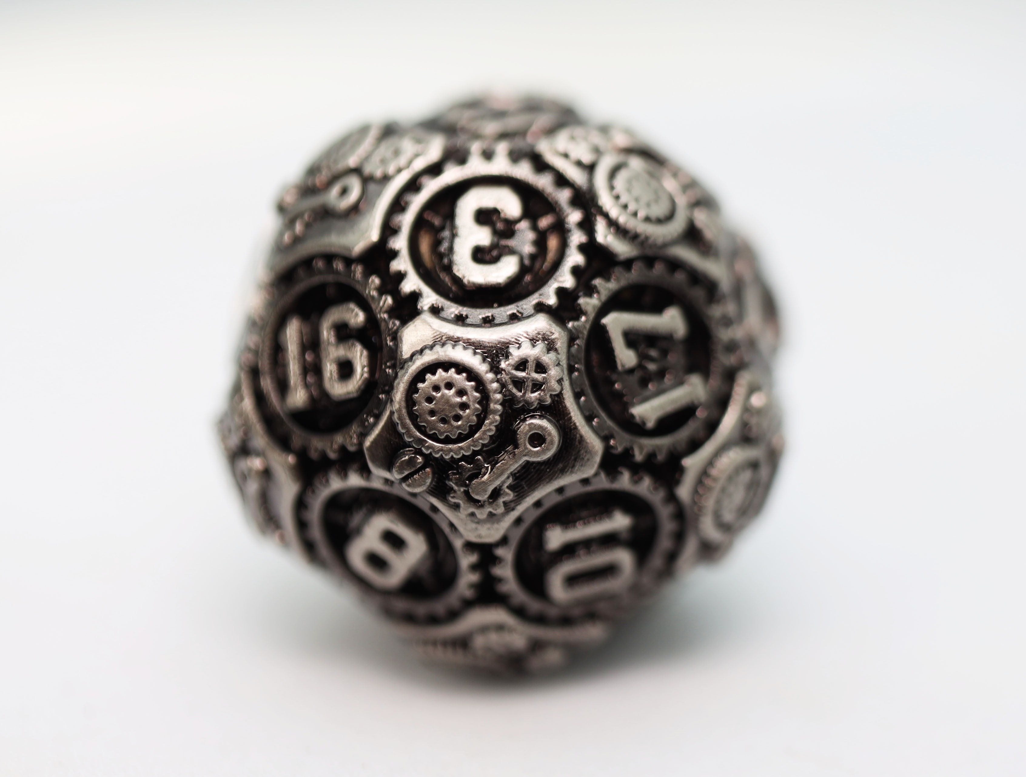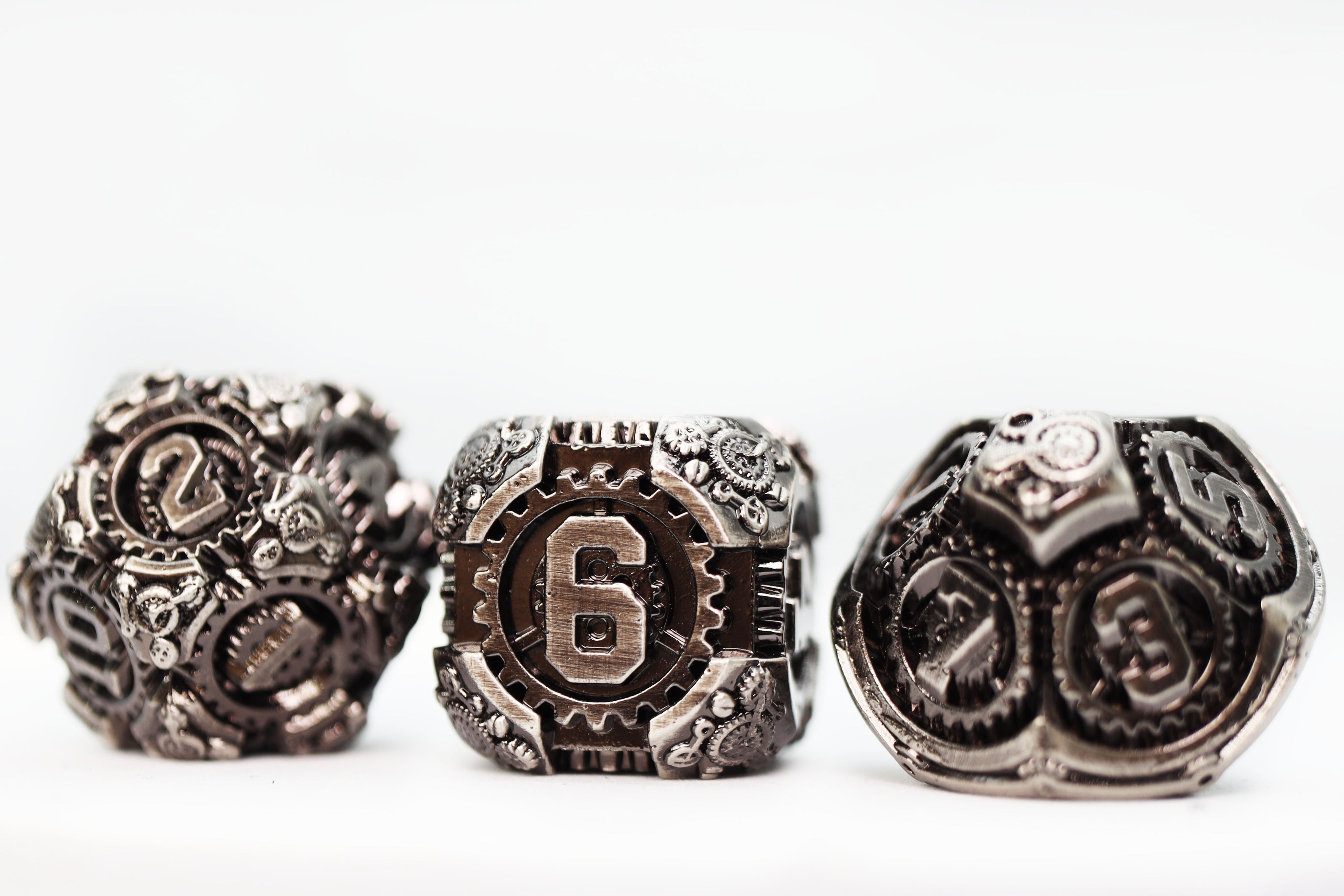 This Foam Brain Games Metal Dice Set with gear shaped details on the die faces is perfect for your next Steampunk adventure!