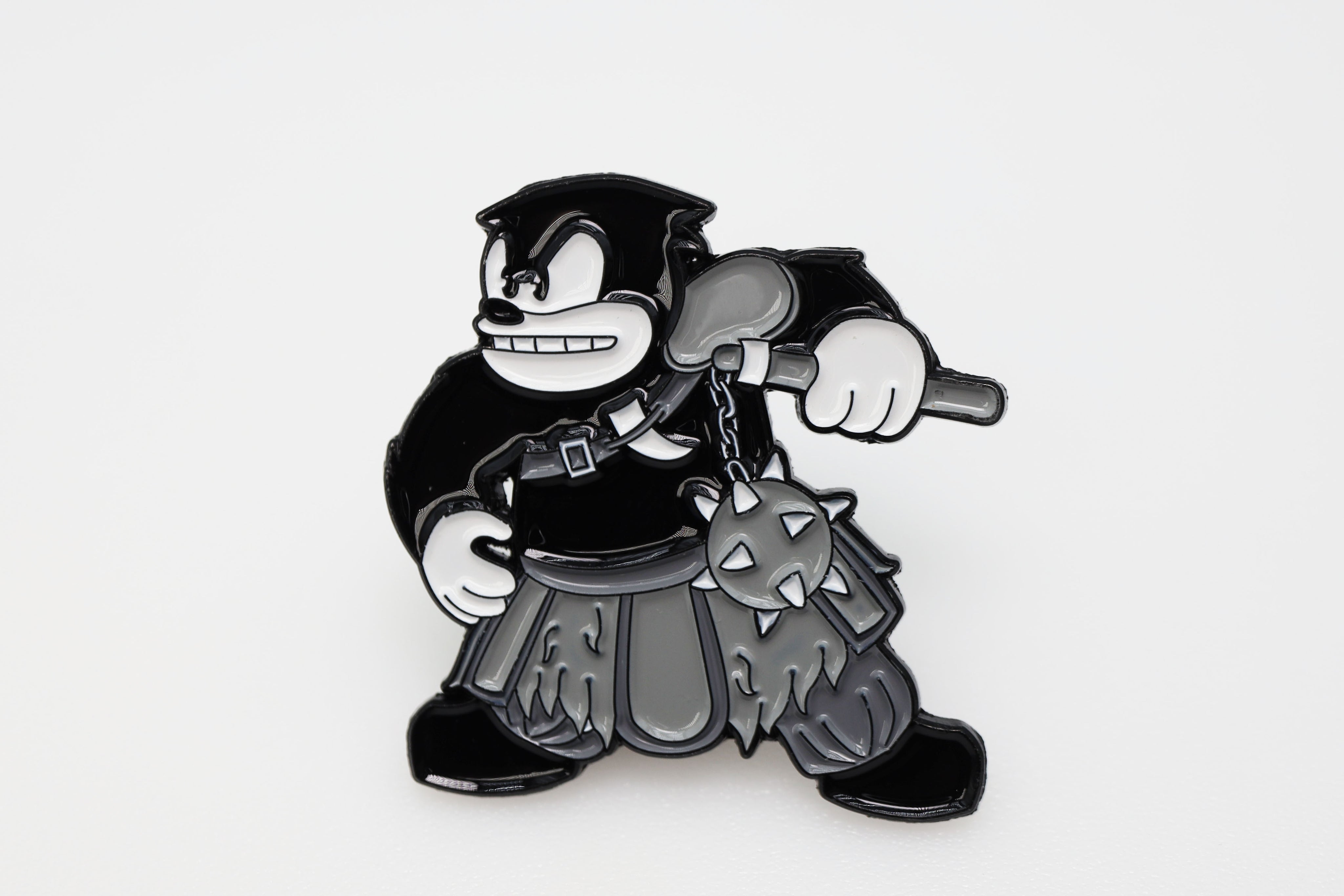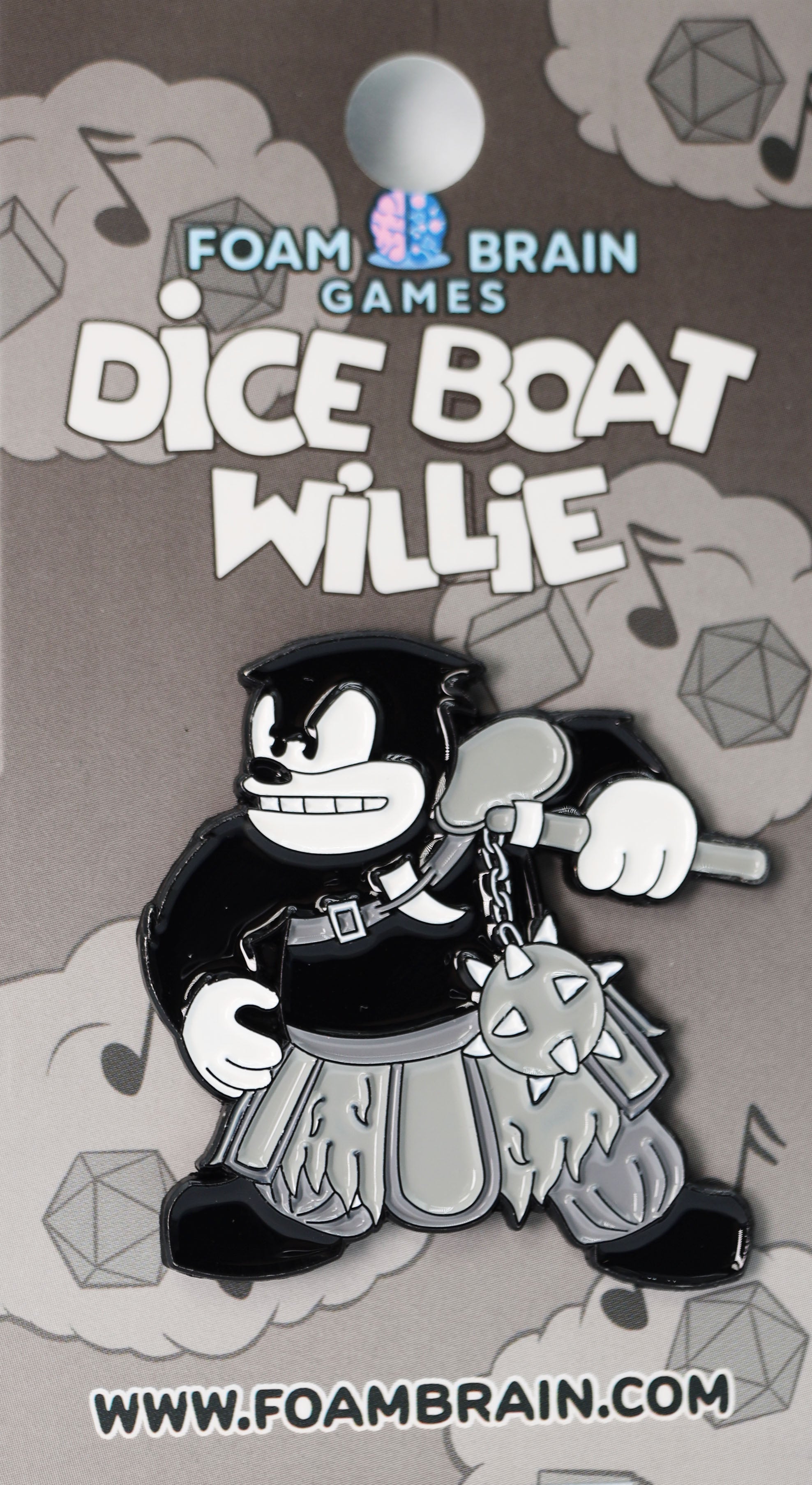 This 1.5" soft enamel pin is black and white and shows us an alternate universe in which a certain steamboat captain took up the mantle of a barbarian.