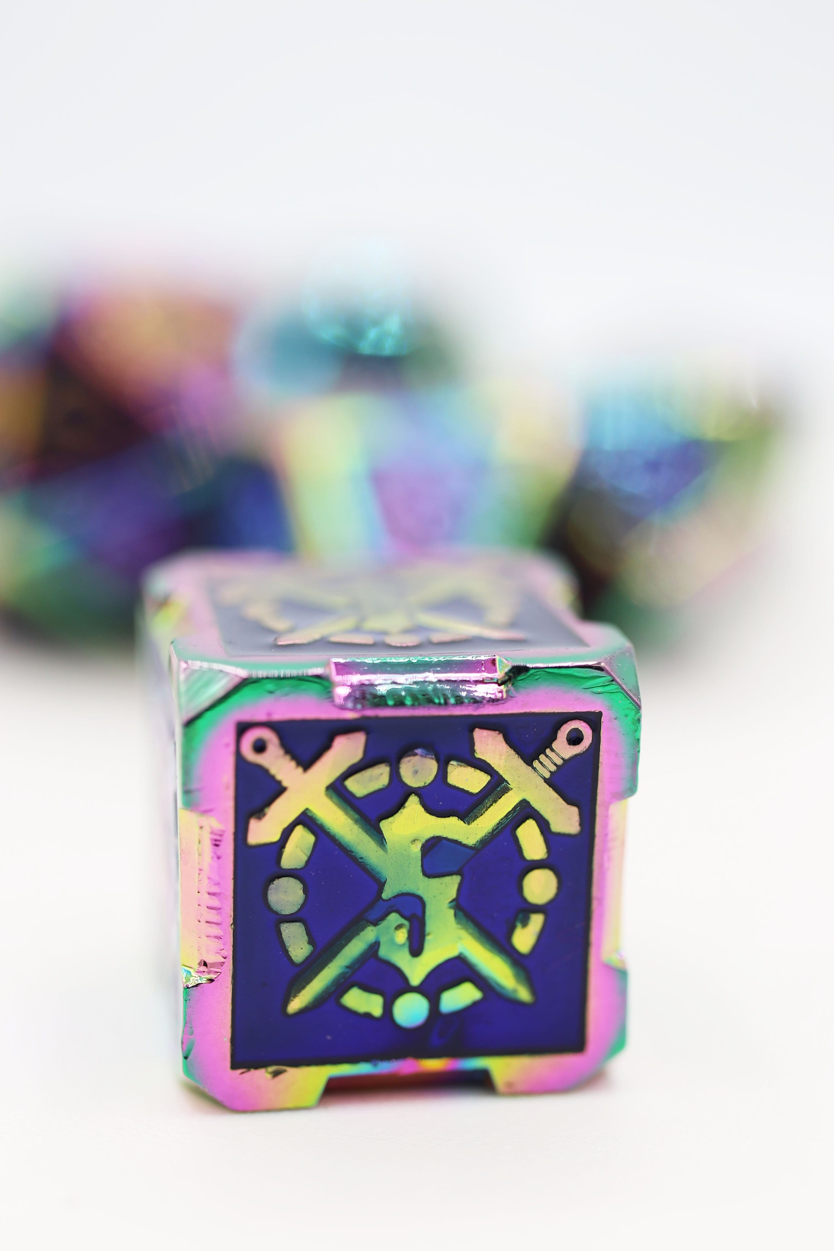 Foam Brain Games Metal Dice Set with sword shaped details on the dice faces.