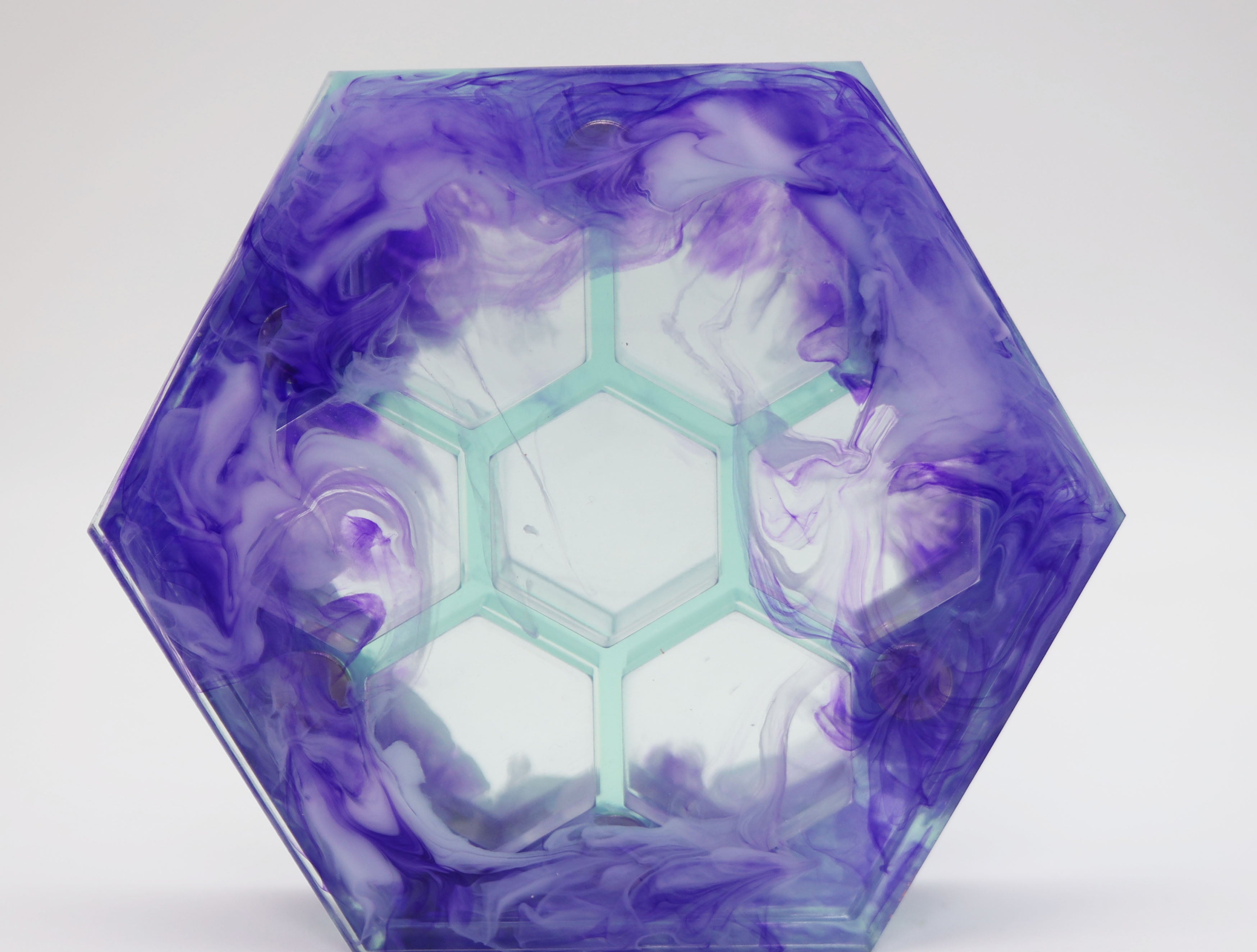 This beautifully made resin hexagonal dice vault is perfect to carry your favorite dice in! The honeycomb design is made to hold one standard size 7 piece RPG dice set. It also features 3 powerful magnetic closures sunk into the resin to keep your dice secure.