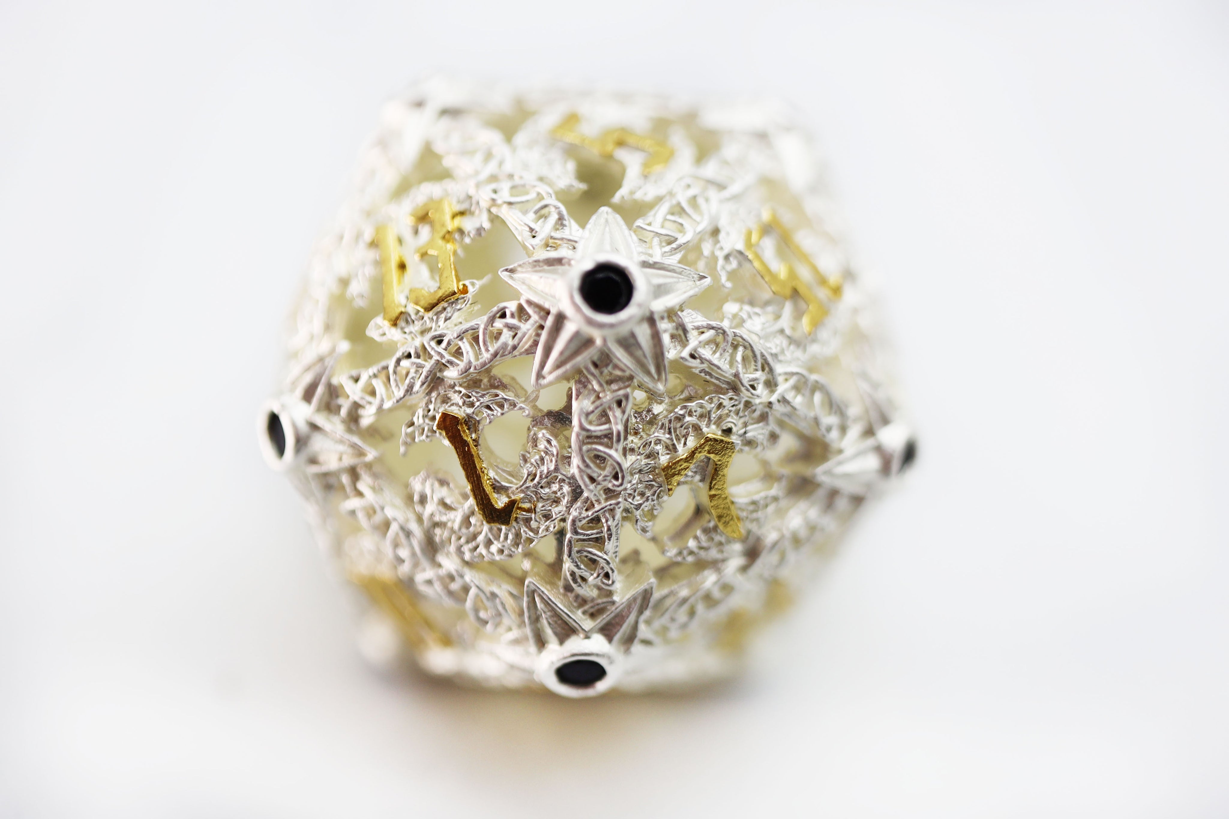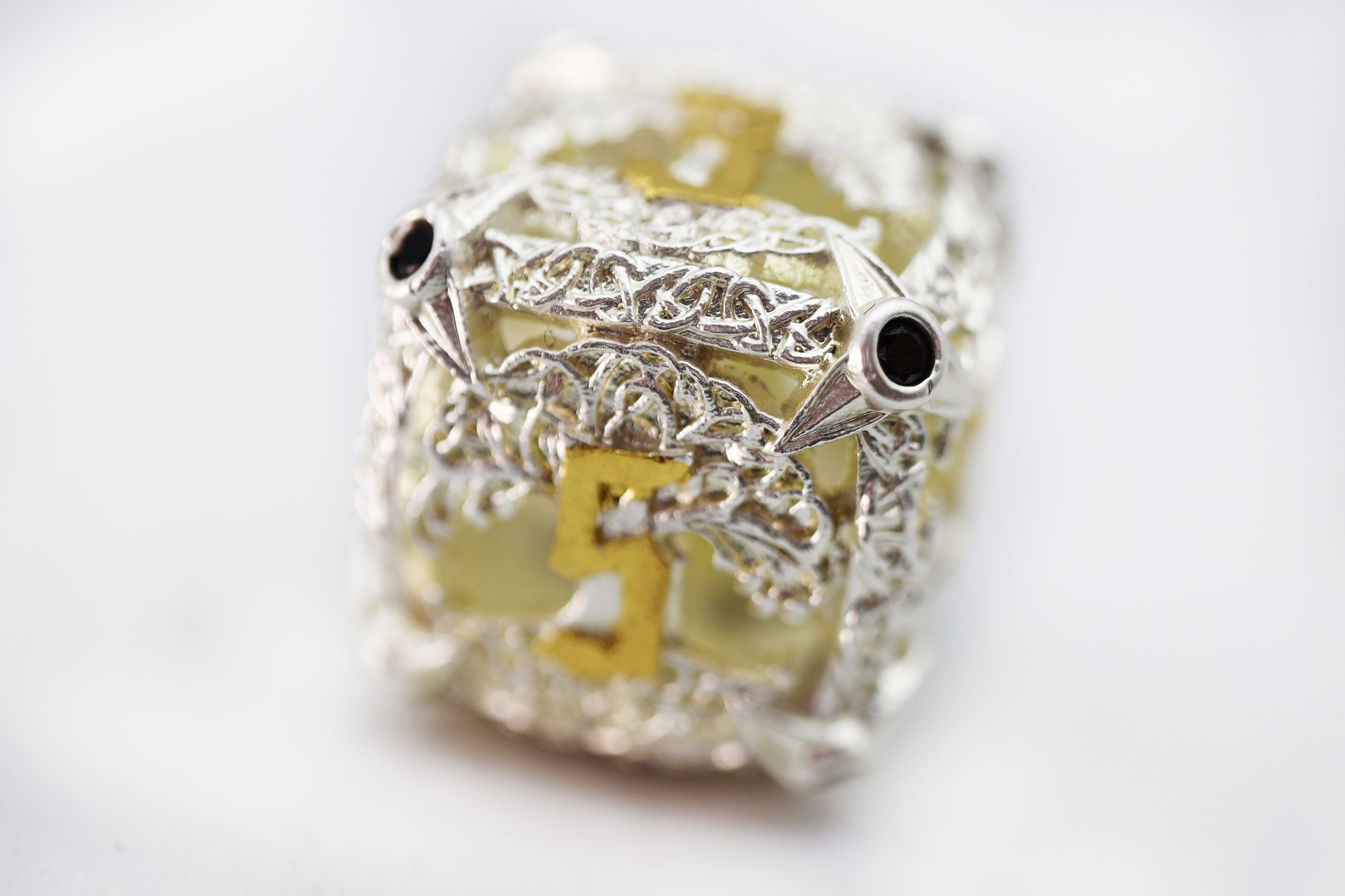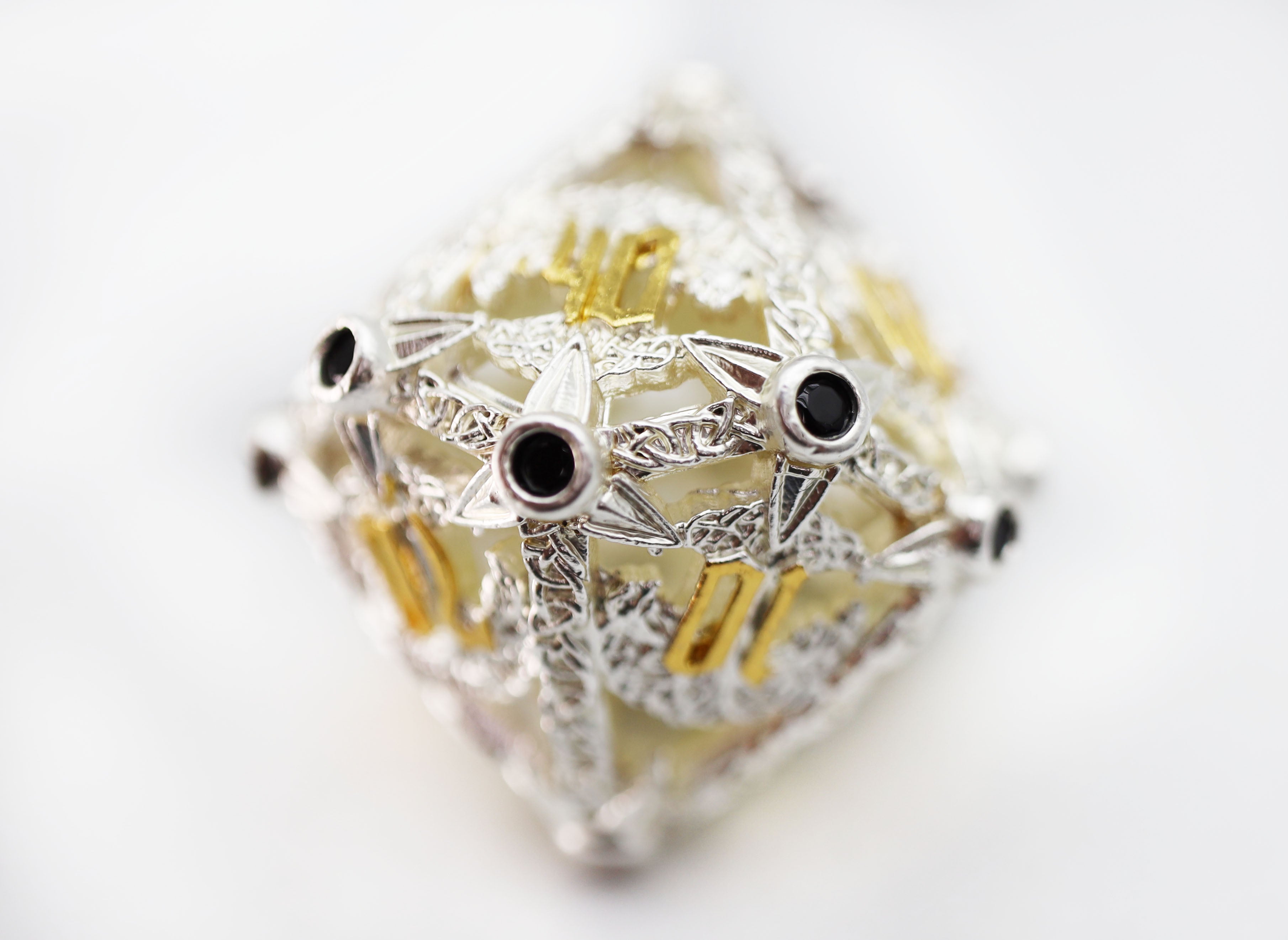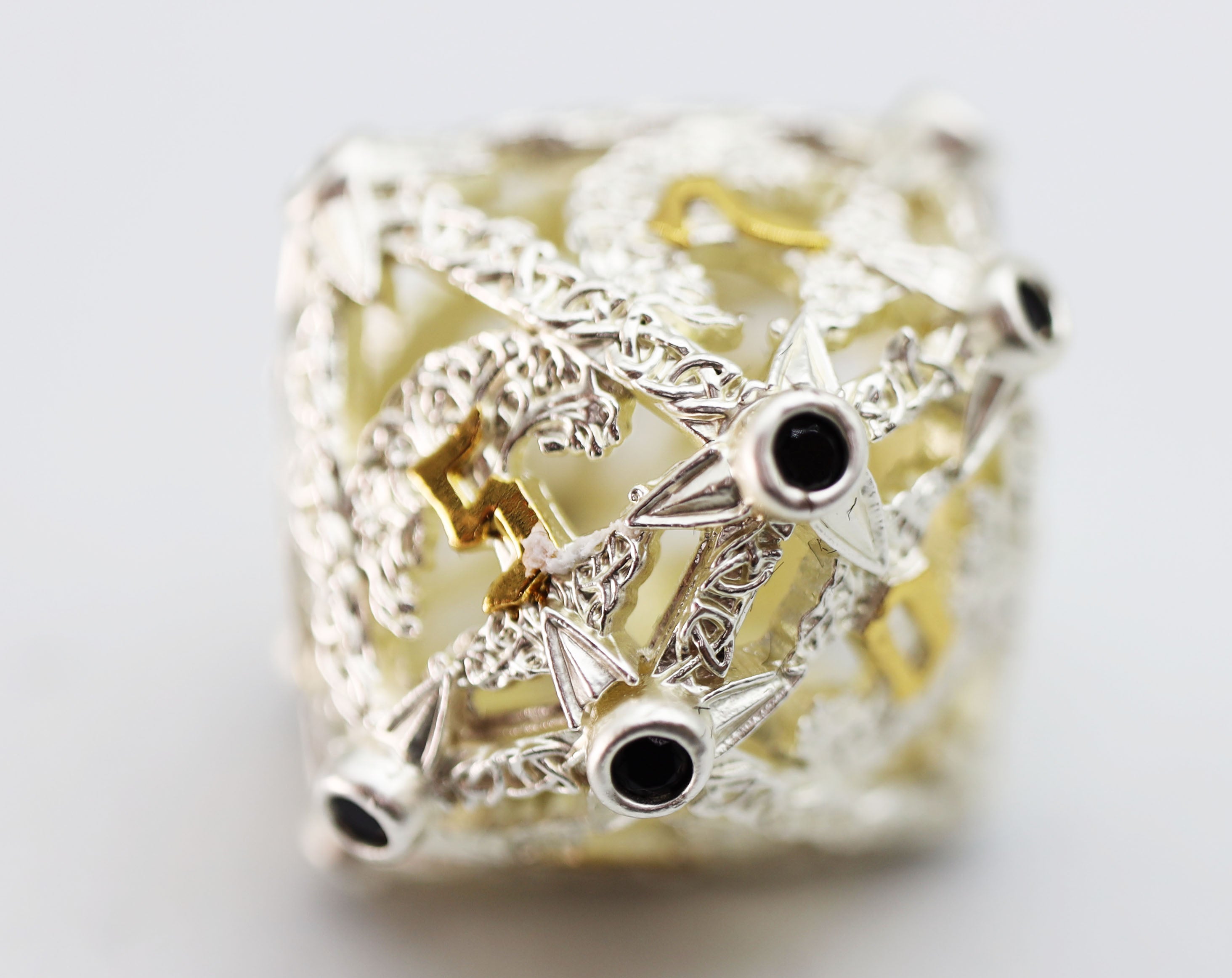 This set of Hollow Dice is medium weight and has a tree motif on the faces and small gems on the corners of each die.