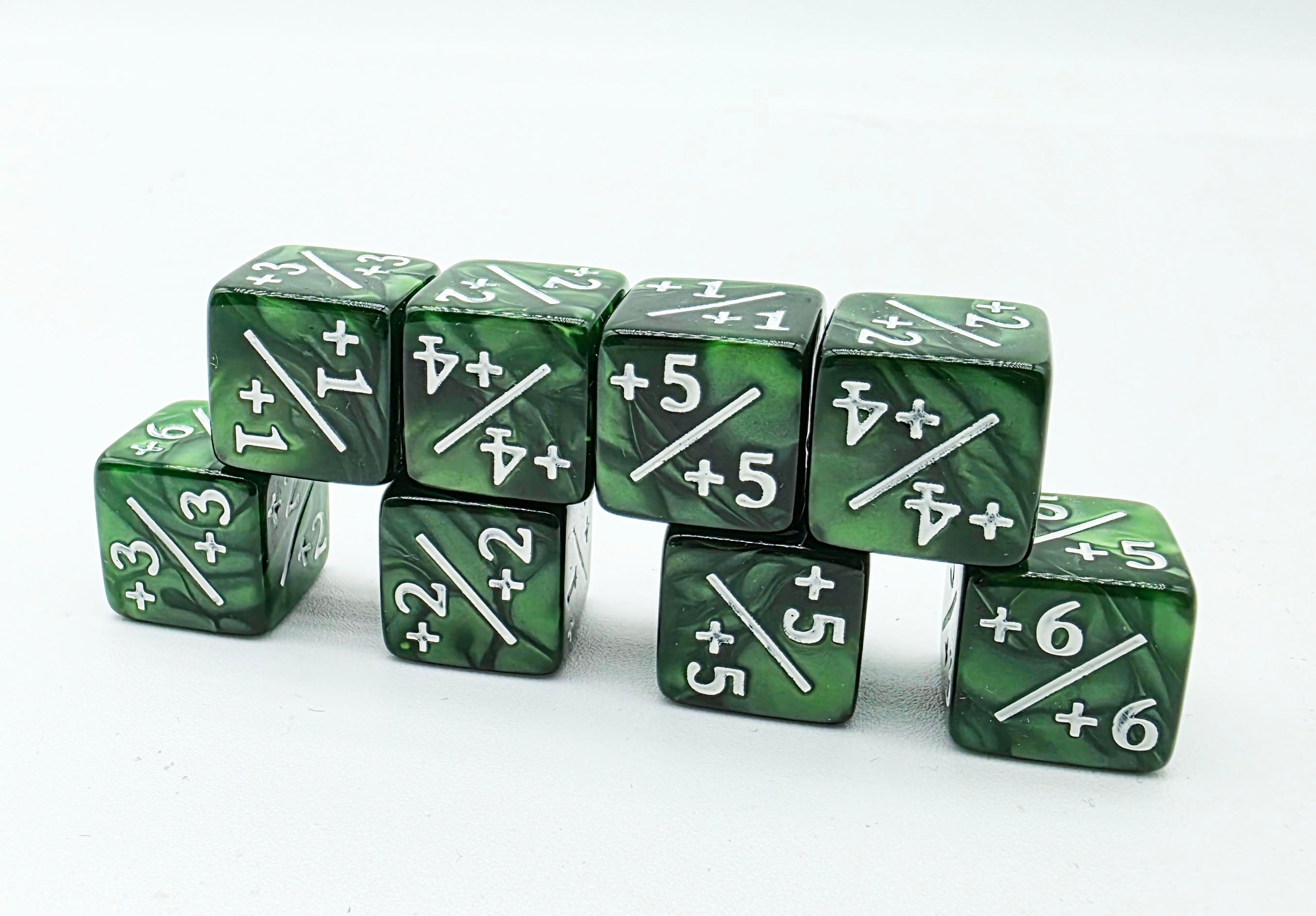 This Counter set is perfect for keeping track in your next deck! Each die is +1/+1 through +6/+6 and comes in a full set of 8 D6s.