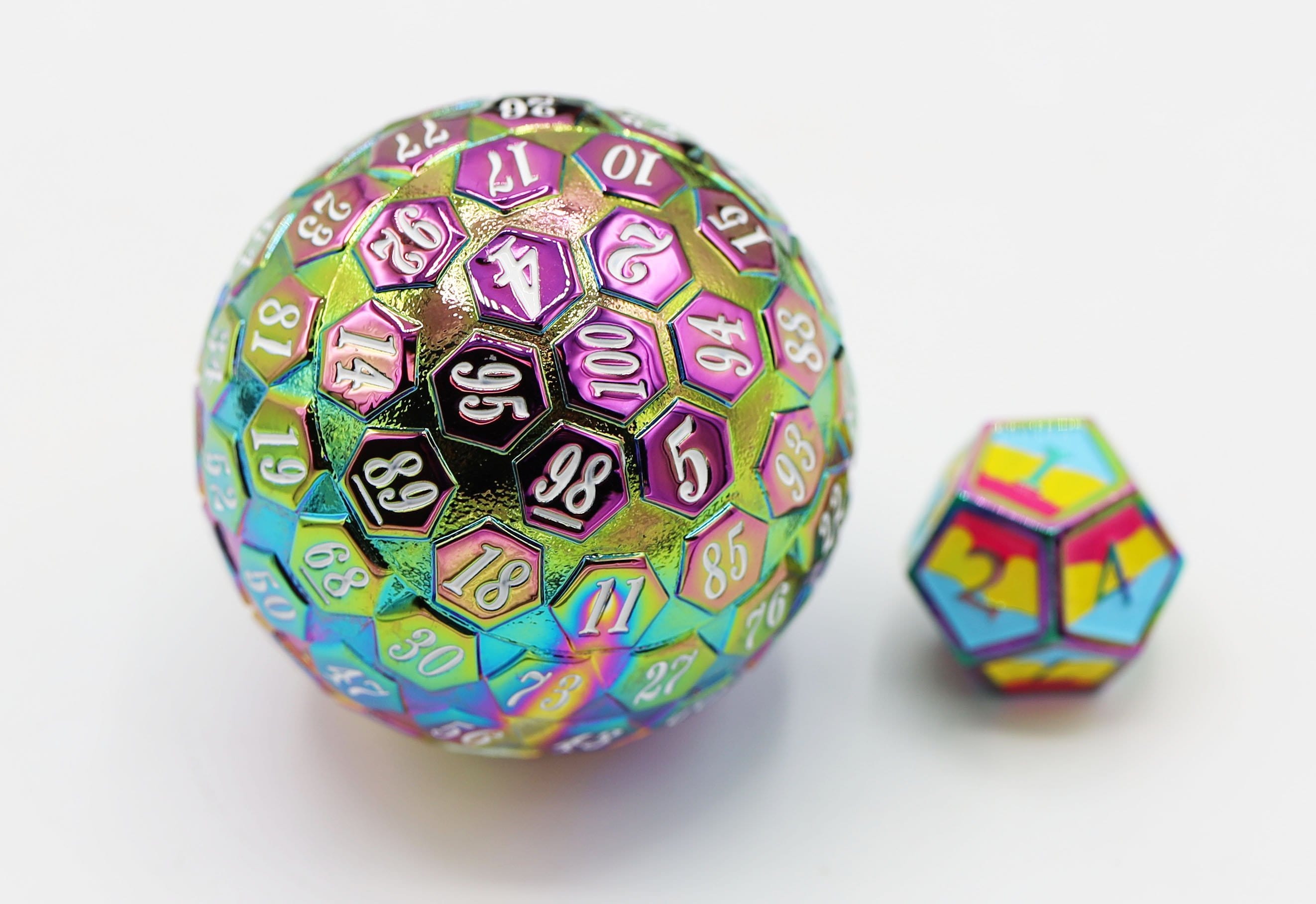 This D100 is AMAZING! It weights nearly 11 ounces and is the heaviest die we've ever carried. The numbers are raised making it very easy to stop rolling and to see which number is facing straight upward.