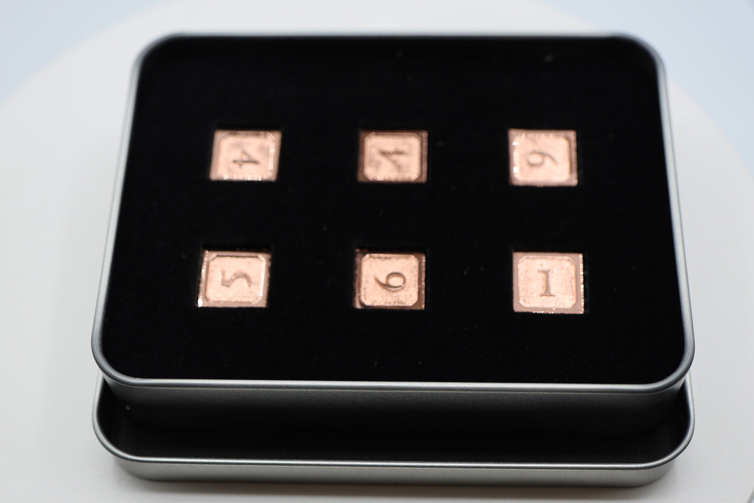 Six copper D6 dice with copper borders and numbers, all in a metal tin with foam cutouts.