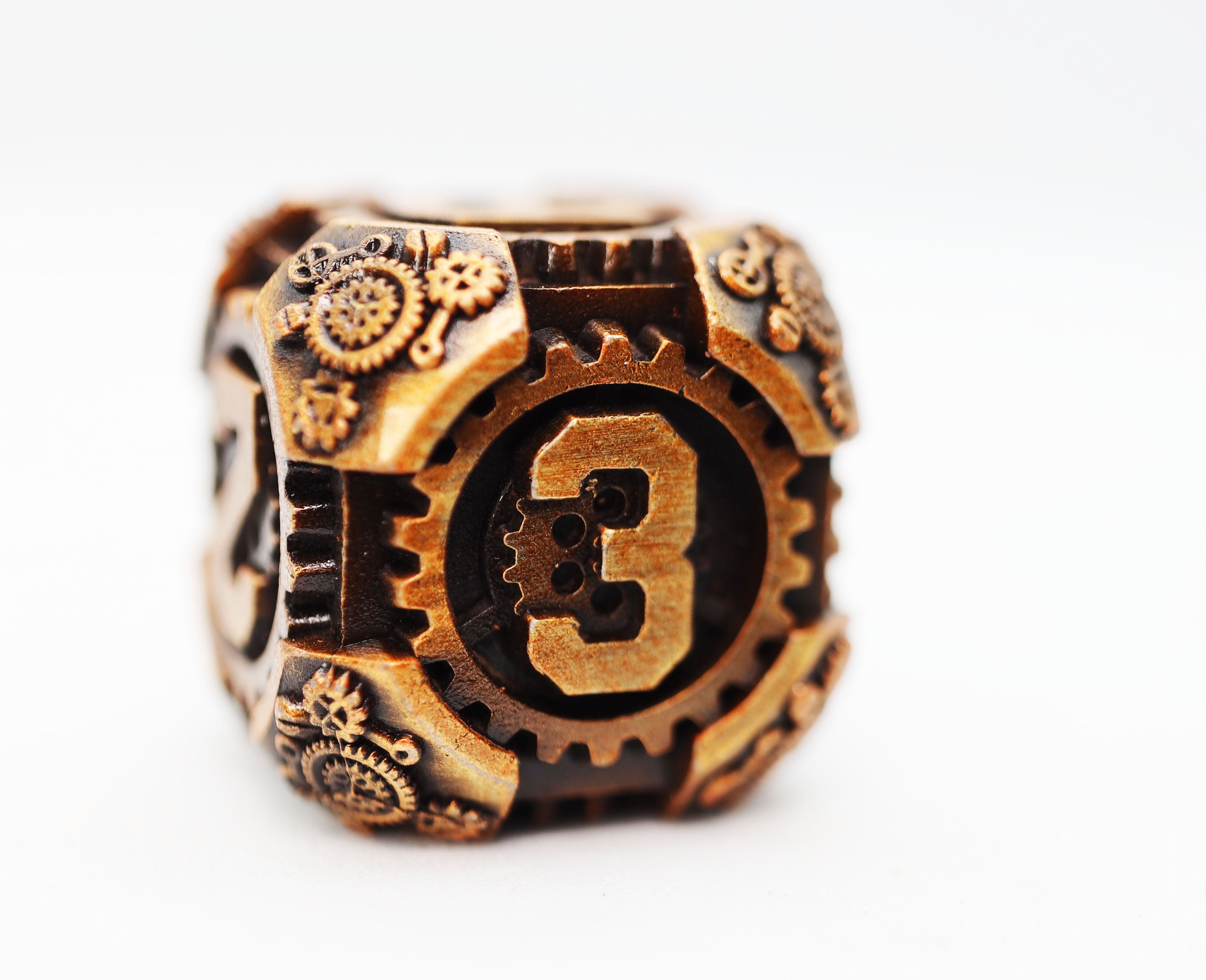 This Foam Brain Games Metal Dice Set with gear shaped details on the die faces is perfect for your next Steampunk adventure!