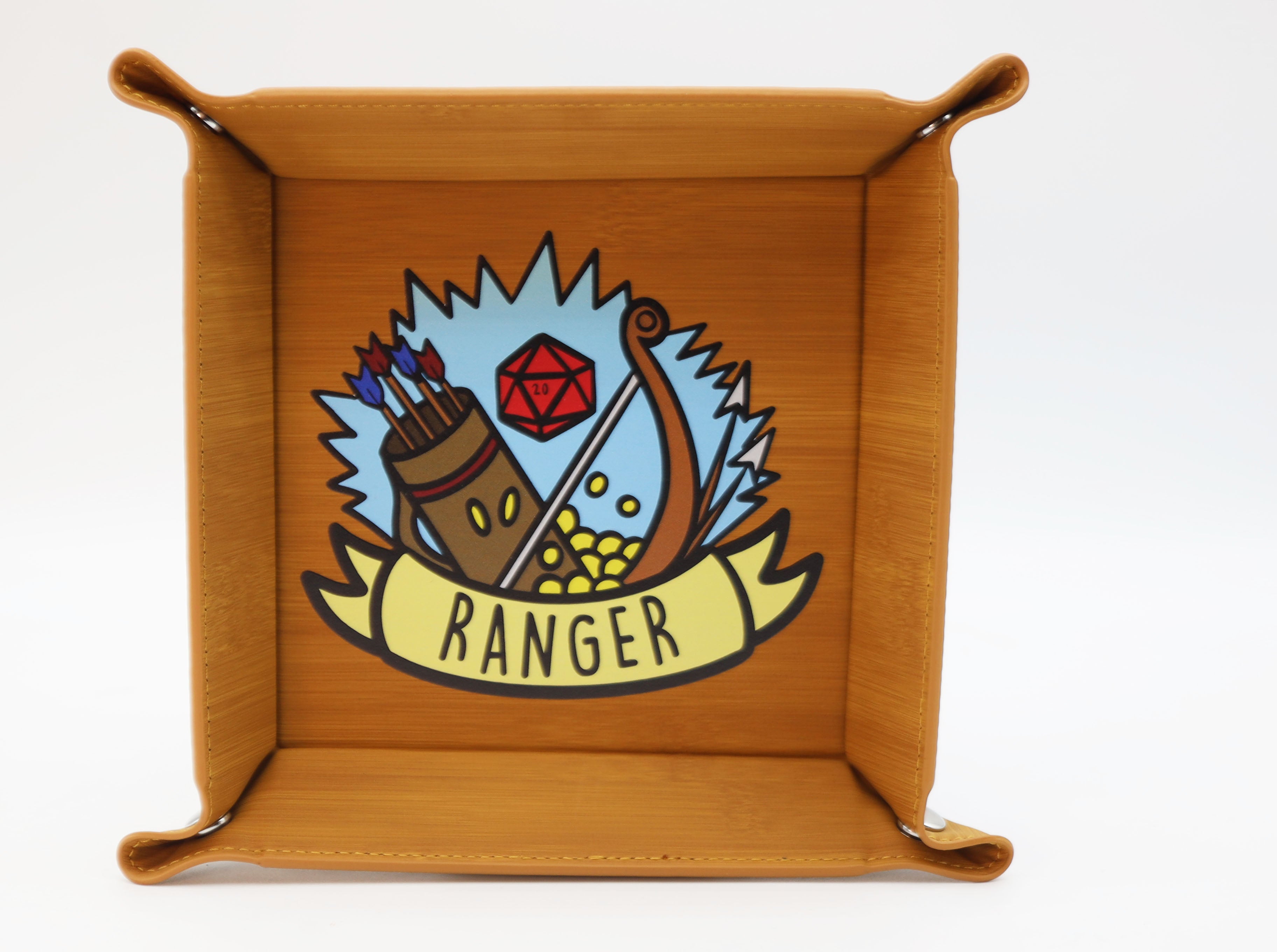 Represent your favorite class with our collapsible dice tray! This dice tray is made with durable leatherette and strong metal snap buttons. It's perfect for the traveling player or Dungeon Master. The tray stays flat and snaps together when you're ready to play!