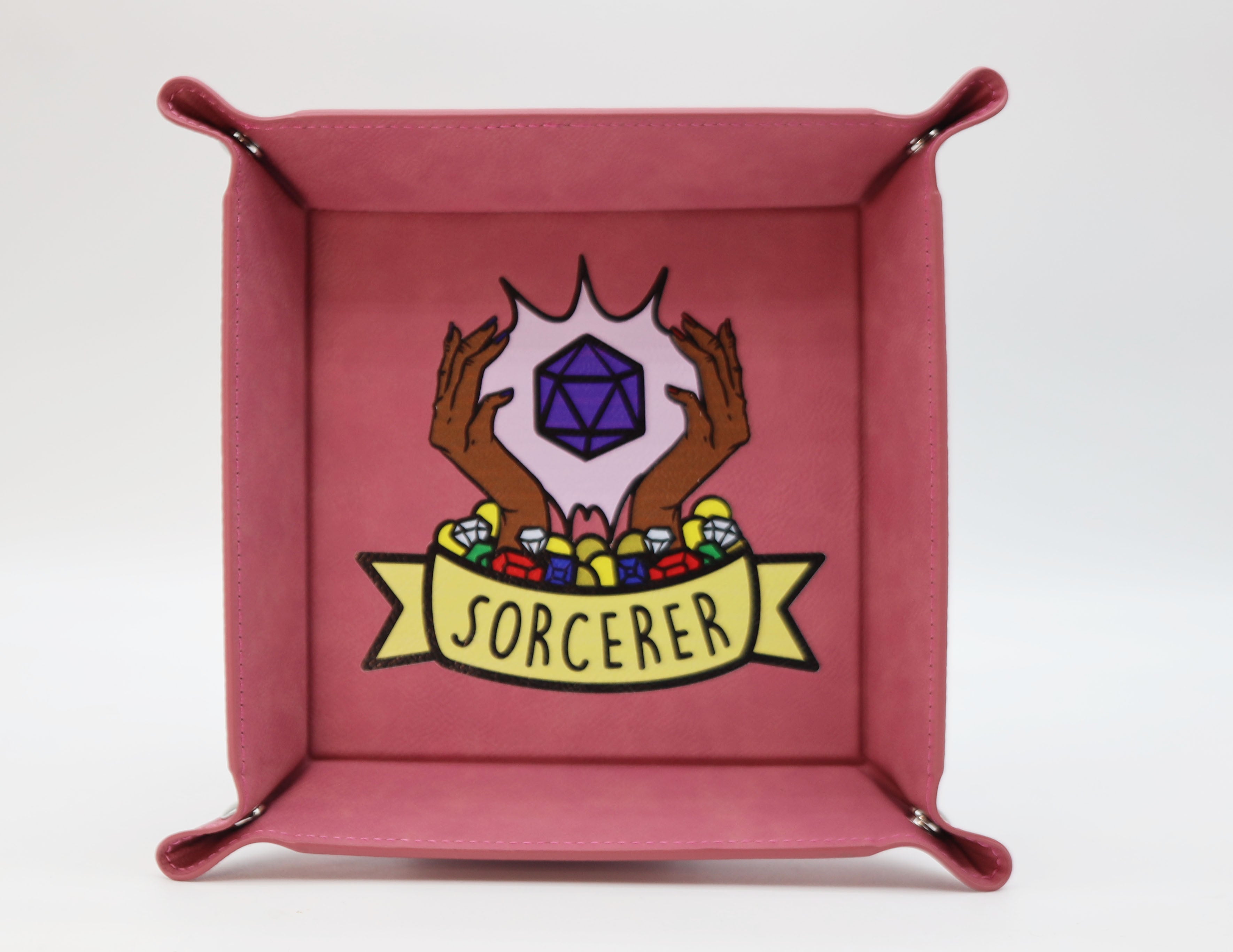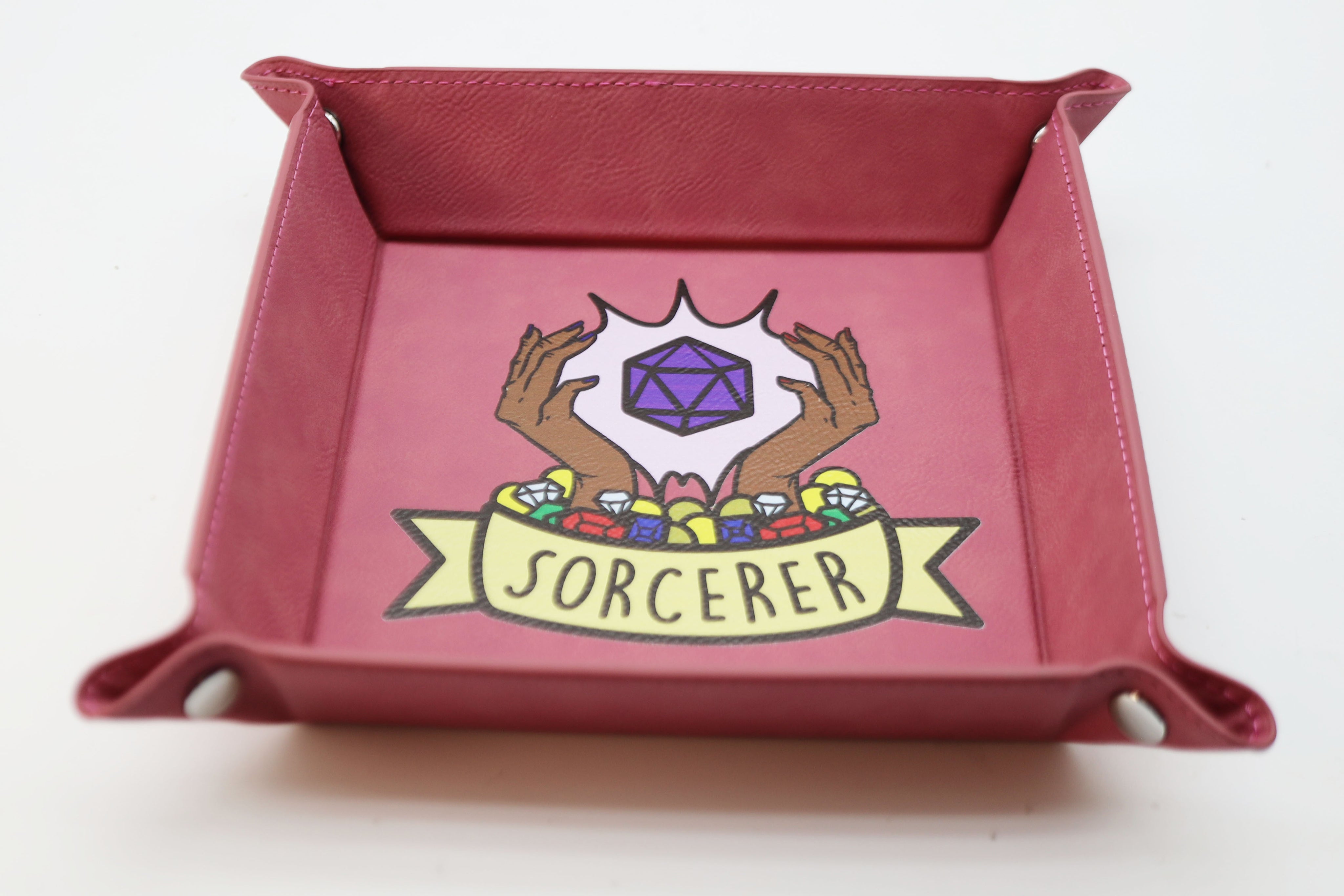 Represent your favorite class with our collapsible dice tray! This dice tray is made with durable leatherette and strong metal snap buttons. It's perfect for the traveling player or Dungeon Master. The tray stays flat and snaps together when you're ready to play!