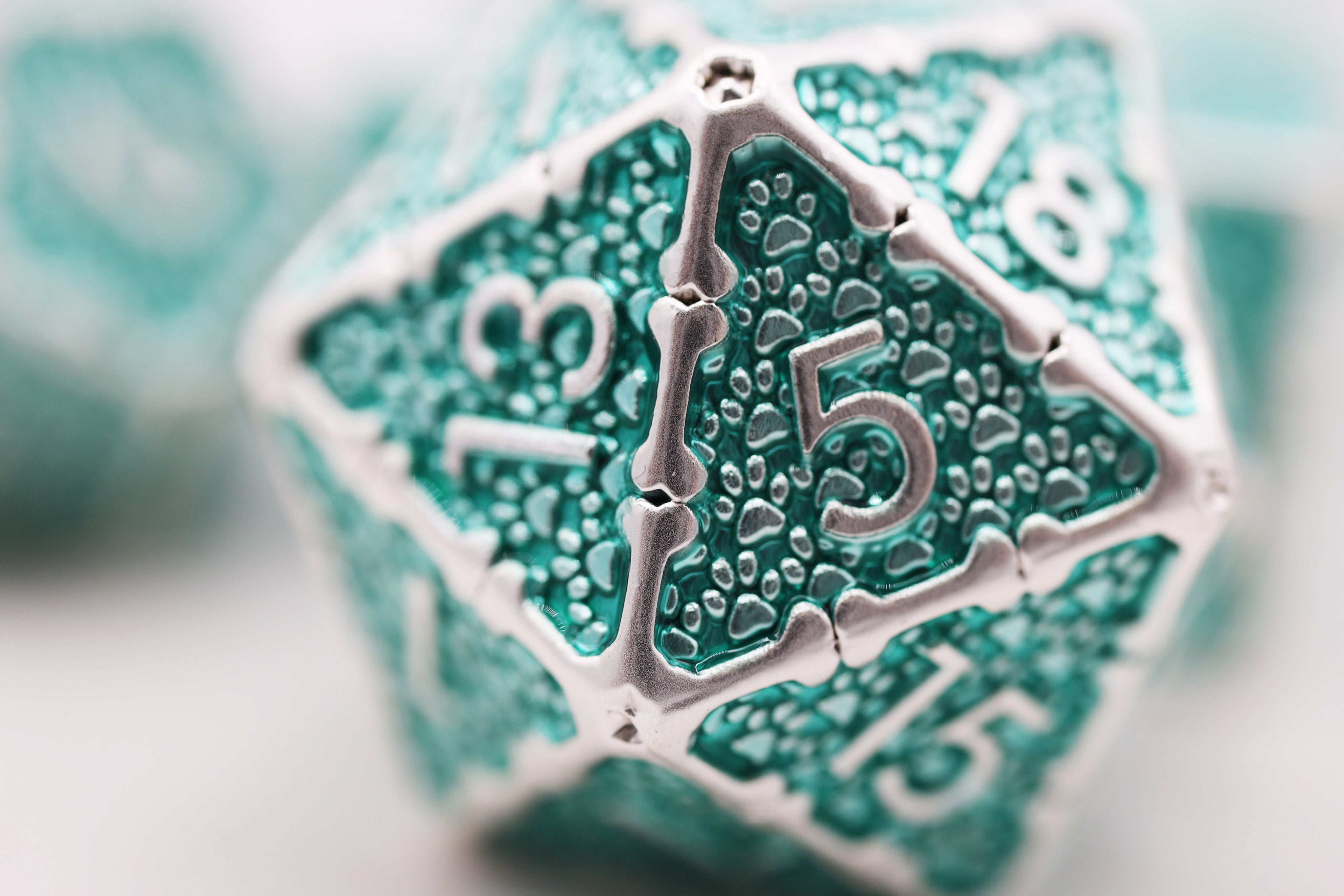 Foam Brain Games Metal Dice Set with paw print texture on the die faces and bone details on the edges.