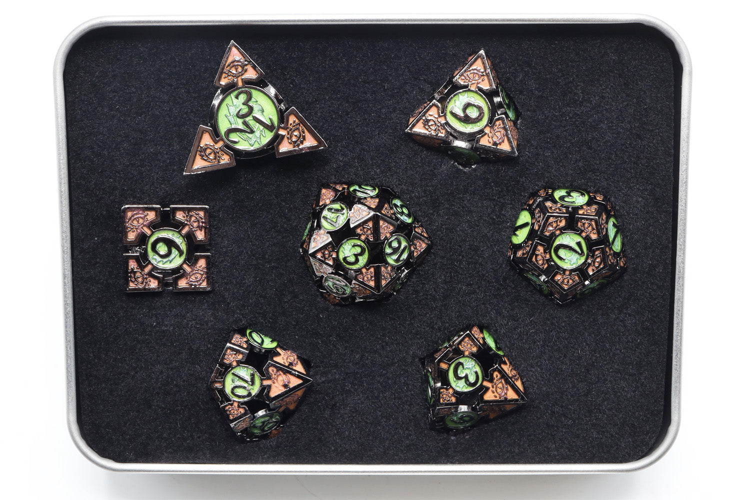 This Foam Brain Games Hollow Metal Dice Set with eye details on the die faces is sure to draw an envious gaze from your fellow adventurers.