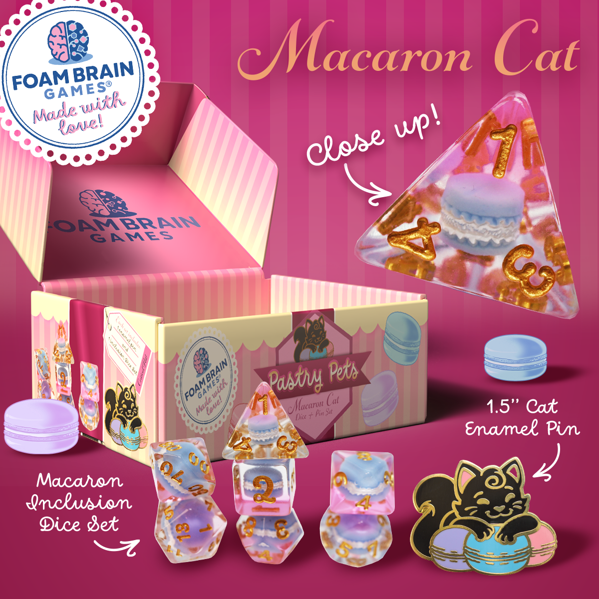Pastry Pets: Macaron Cat - Pin & RPG Dice Set
