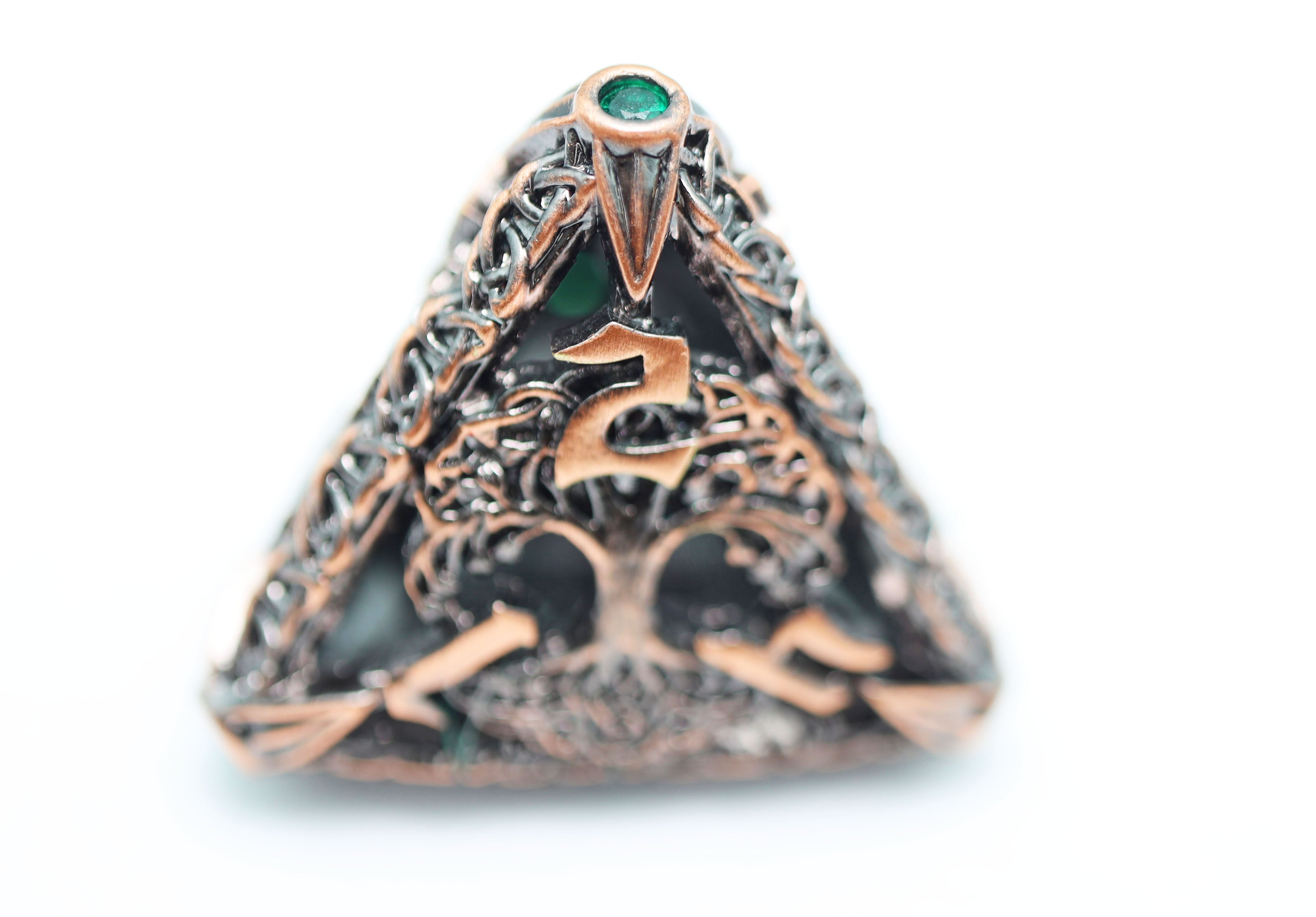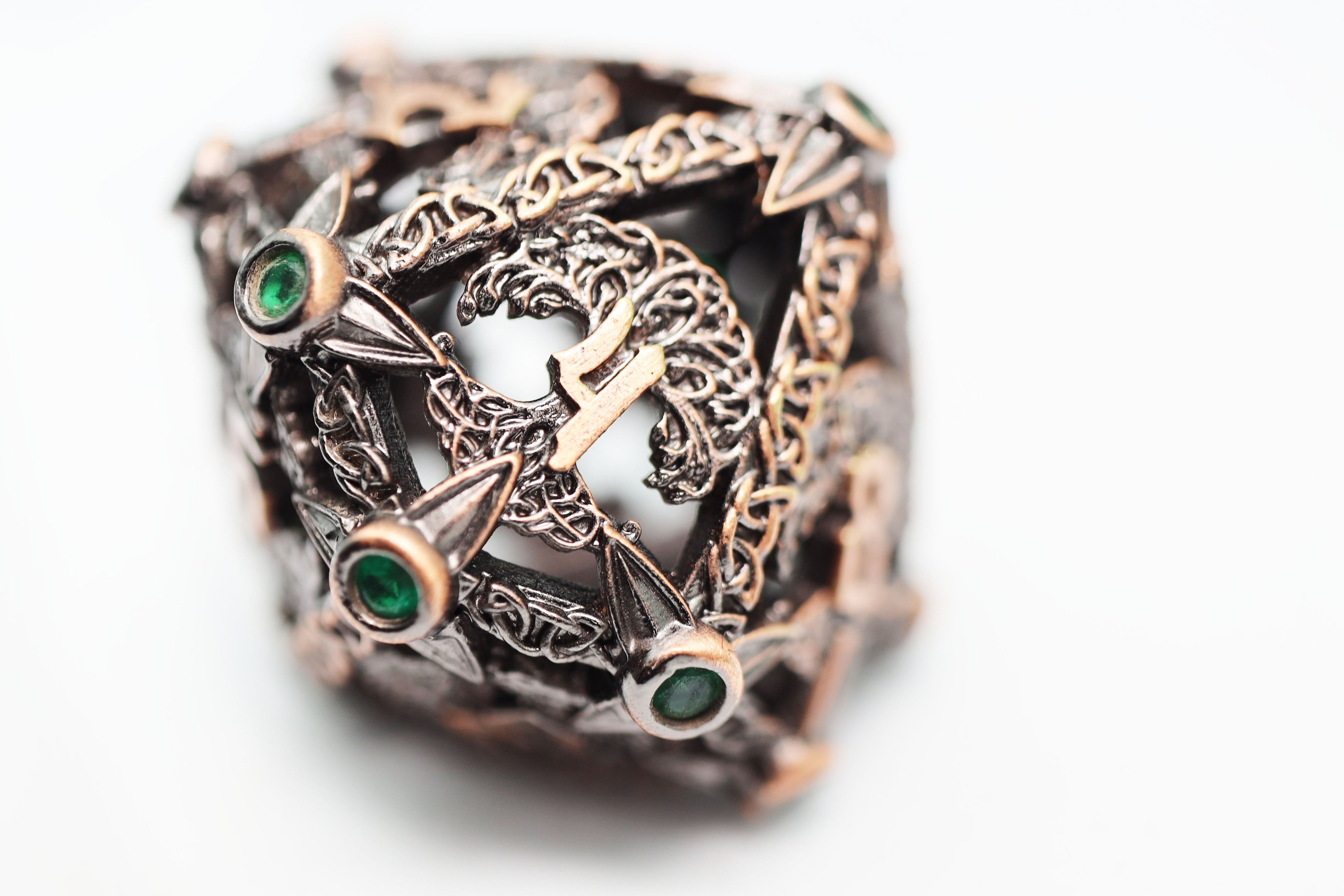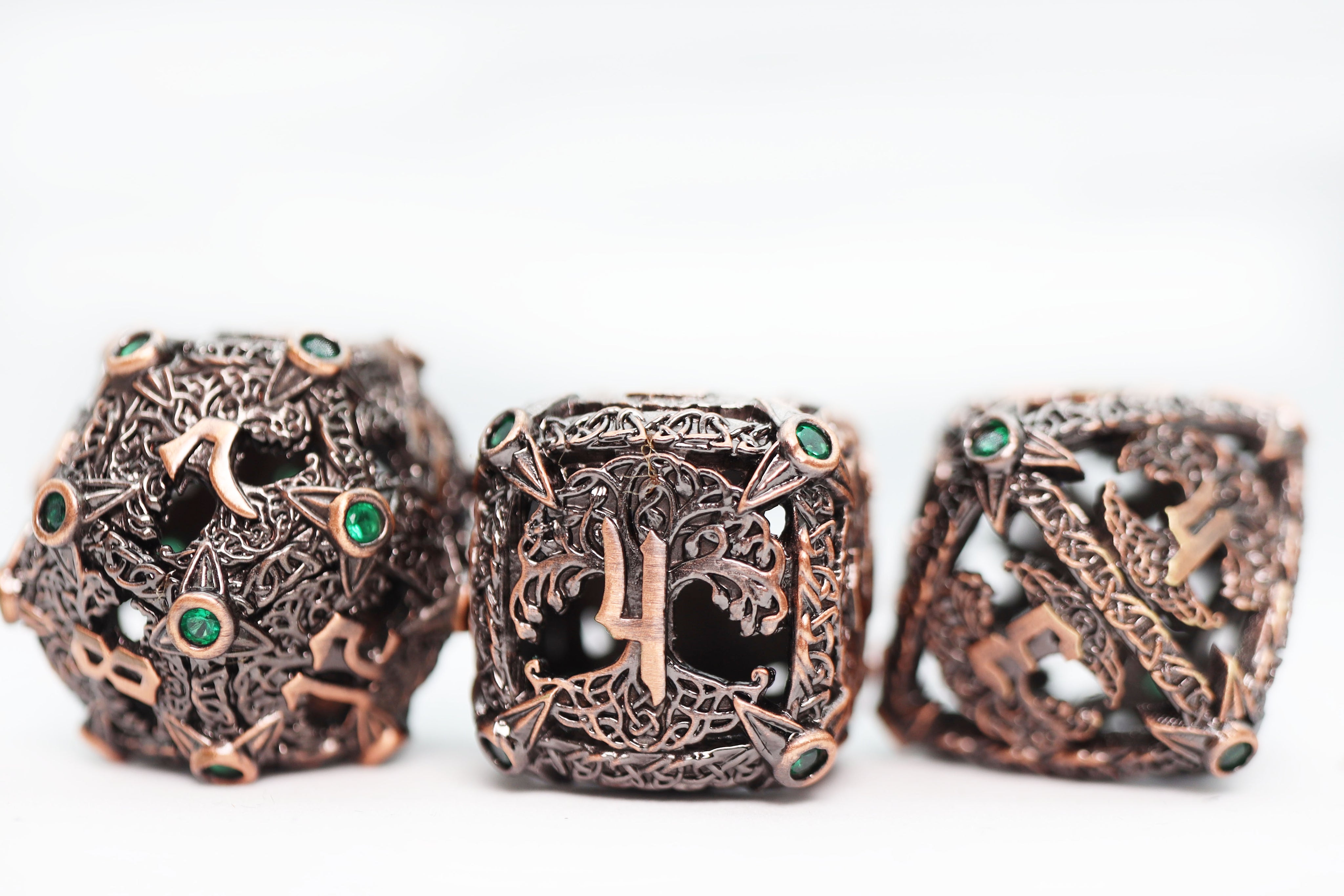 This set of Hollow Dice is medium weight and has a tree motif on the faces and small gems on the corners of each die.